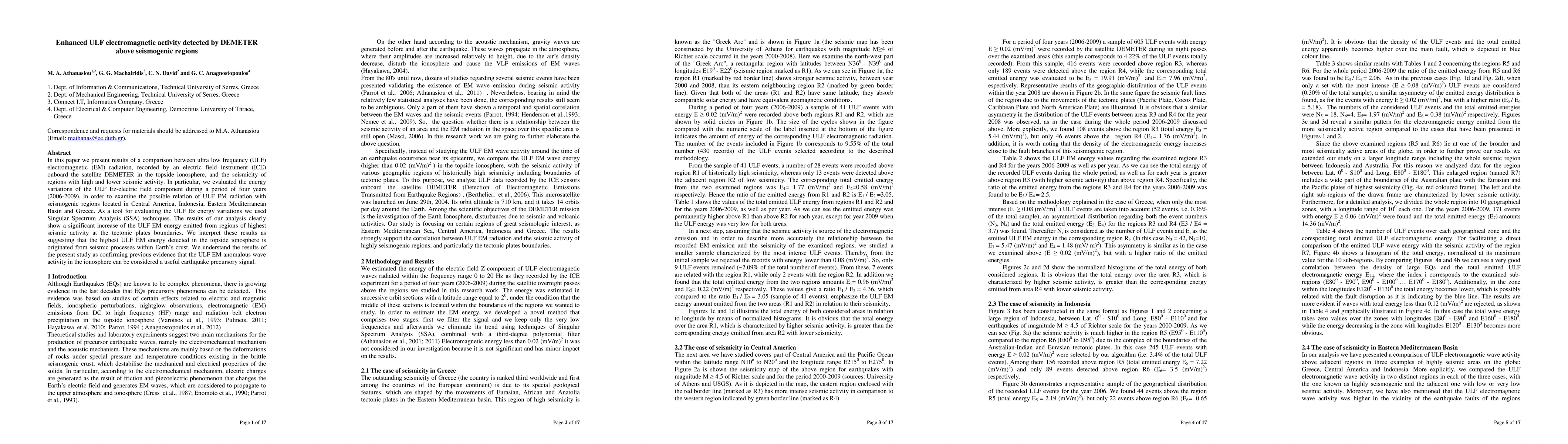In this paper we present results of a comparison between ultra low frequency (ULF) electromagnetic (EM) radiation, recorded by an electric field instrument (ICE) onboard the satellite DEMETER in the topside ionosphere, and the seismicity of regions with high and lower seiismic activity. In particular we evaluated the energy variations of the ULF Ez-electric field component during a period of four years (2006-2009), in order to examine check the possible relation of ULF EM radiation with seismogenic regions located in central America, Indonesia, Eastern Mediterranean Basin and Greece. As a tool of evaluating the ULF Ez energy variations we used Singular Spectrum Analysis (SSA) techniques. The results of our analysis clearly show a significant increase of the ULF EM energy emmited from regions of highest seismic activity at the tectonic plates boundaries. We interpret these results as suggesting that the highest ULF EM energy detected in the topside ionosphere is originated from seismic processes within Earth's crust. We understand the results of the present study as confirming previous evidence that the ULF EM anomalous wave activity in the ionosphere can be considered a useful earthquake precursory signal