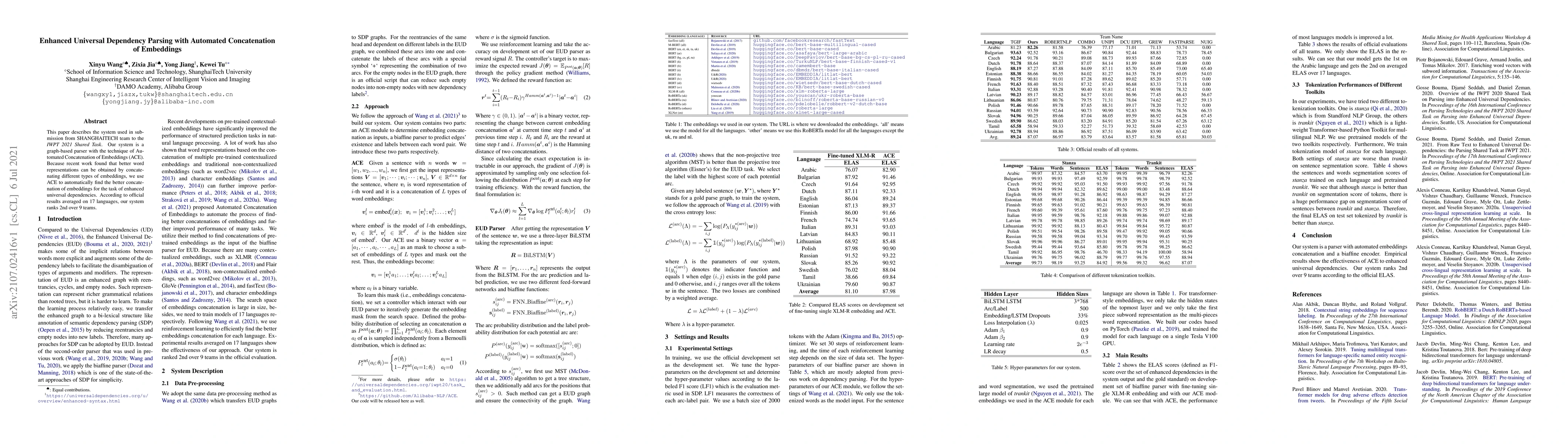 This paper describes the system used in submission from SHANGHAITECH team to the IWPT 2021 Shared Task. Our system is a graph-based parser with the technique of Automated Concatenation of Embeddings (ACE). Because recent work found that better word representations can be obtained by concatenating different types of embeddings, we use ACE to automatically find the better concatenation of embeddings for the task of enhanced universal dependencies. According to official results averaged on 17 languages, our system ranks 2nd over 9 teams.