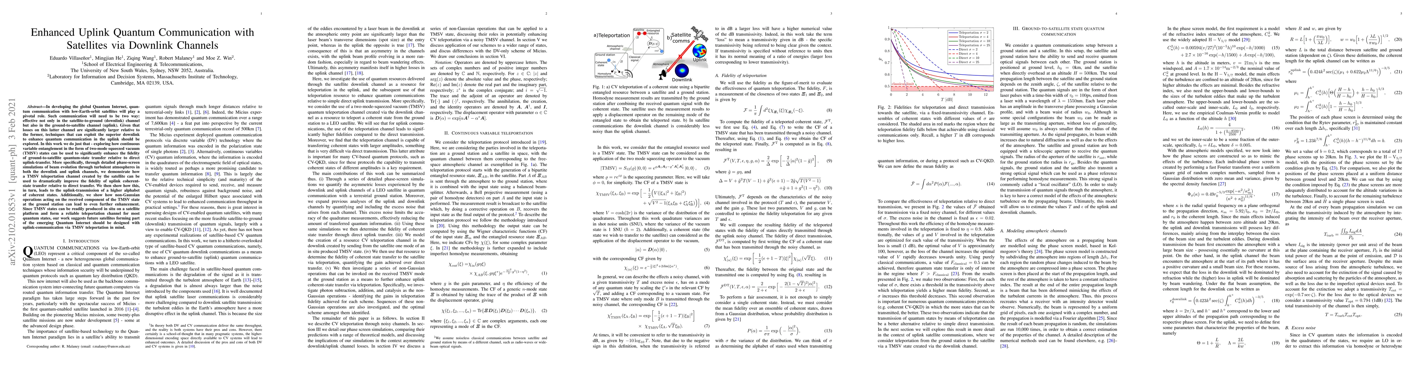In developing the global Quantum Internet, quantum communication with low-Earth-orbit satellites will play a pivotal role. Such communication will need to be two way: effective not only in the satellite-to-ground (downlink) channel but also in the ground-to-satellite channel (uplink). Given that losses on this latter channel are significantly larger relative to the former, techniques that can exploit the superior downlink to enhance quantum communication in the uplink should be explored. In this work we do just that - exploring how continuous variable entanglement in the form of two-mode squeezed vacuum (TMSV) states can be used to significantly enhance the fidelity of ground-to-satellite quantum-state transfer relative to direct uplink-transfer. More specifically, through detailed phase-screen simulations of beam evolution through turbulent atmospheres in both the downlink and uplink channels, we demonstrate how a TMSV teleportation channel created by the satellite can be used to dramatically improve the fidelity of uplink coherent-state transfer relative to direct transfer. We then show how this, in turn, leads to the uplink-transmission of a higher alphabet of coherent states. Additionally, we show how non-Gaussian operations acting on the received component of the TMSV state at the ground station can lead to even further enhancement. Since TMSV states can be readily produced in situ on a satellite platform and form a reliable teleportation channel for most quantum states, our work suggests future satellites forming part of the emerging Quantum Internet should be designed with uplink-communication via TMSV teleportation in mind.