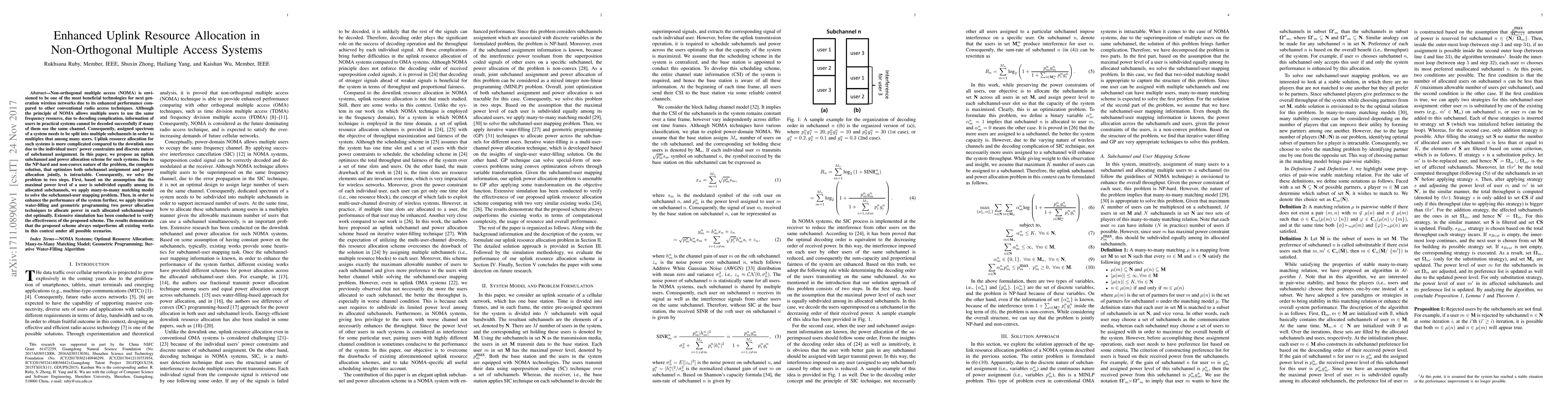 This paper proposes an uplink subchannel and power allocation scheme for non-orthogonal multiple access (NOMA) systems, addressing the complexity of decoding in practical systems. The scheme involves a two-step solution: a many-to-many matching model for subchannel-user mapping followed by iterative water-filling and geometric programming for power allocation, demonstrating superior performance over existing methods through extensive simulations.
