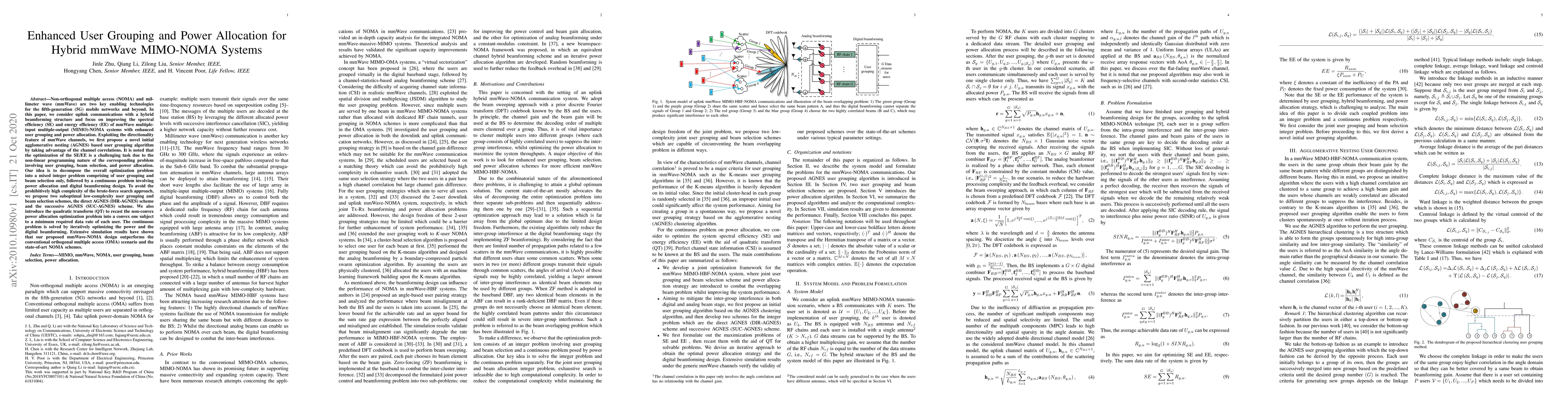 This paper proposes enhanced user grouping and power allocation strategies for mmWave MIMO-NOMA systems to improve spectral and energy efficiency. It introduces an AGNES-based user grouping algorithm and decomposes the optimization problem into manageable parts, proposing low-complexity schemes and a quadratic transform for convex power allocation optimization. Simulation results show superior performance compared to conventional OMA and existing NOMA schemes.