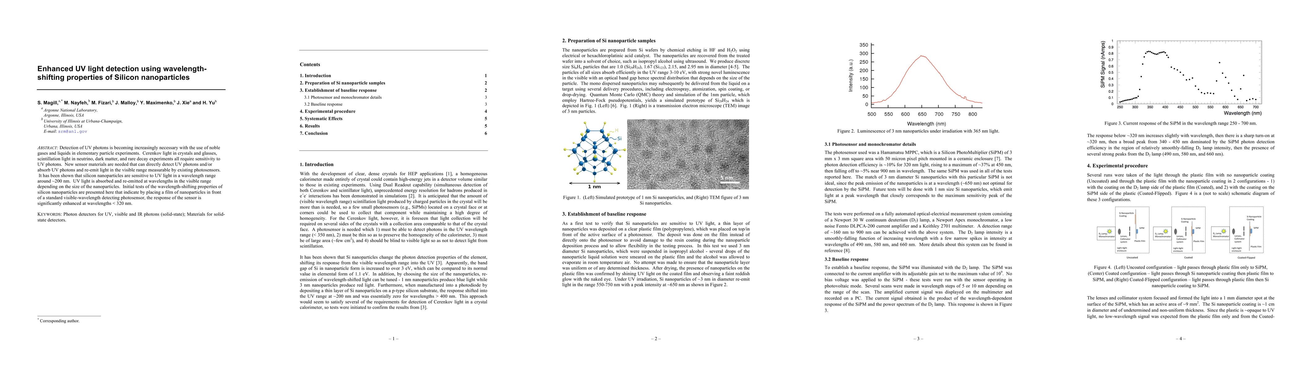This paper investigates the use of silicon nanoparticles for enhanced UV light detection, leveraging their ability to absorb UV photons and re-emit them in the visible range, thereby improving the sensitivity of existing photosensors for applications in particle experiments. Initial tests show a significant enhancement in sensor response when a film of these nanoparticles is used.