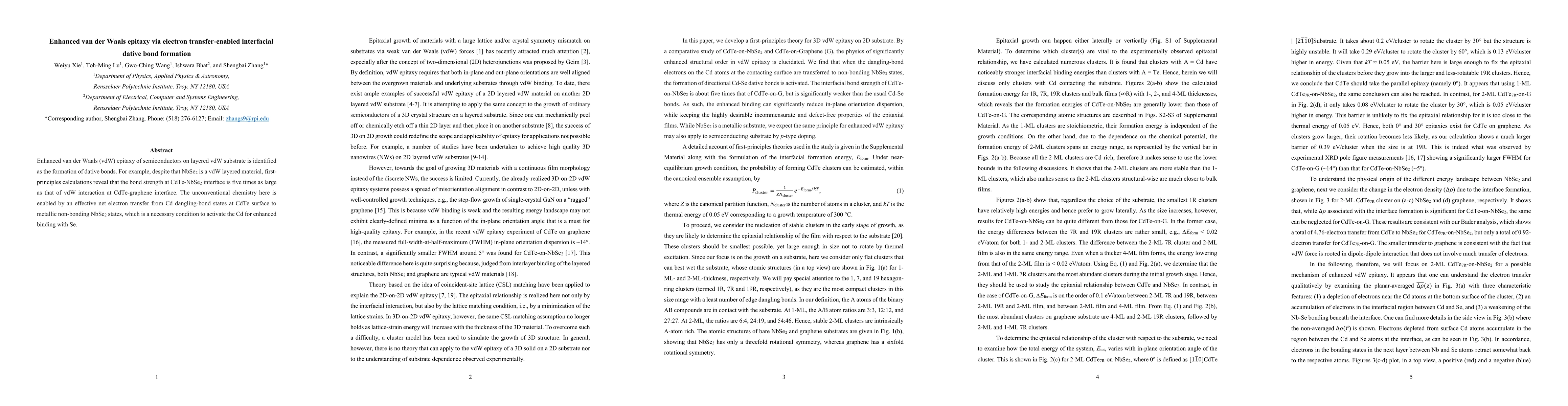 This paper demonstrates enhanced van der Waals epitaxy through electron transfer-enabled dative bond formation, showing that CdTe on NbSe2 forms bonds five times stronger than on graphene due to net electron transfer from CdTe to NbSe2, activating stronger binding.
