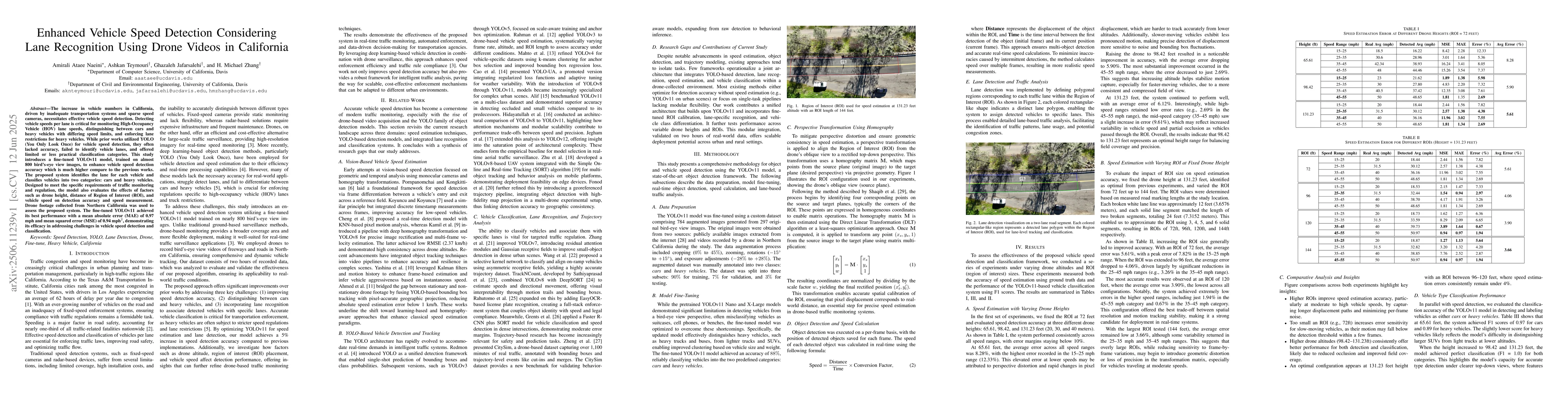 The increase in vehicle numbers in California, driven by inadequate transportation systems and sparse speed cameras, necessitates effective vehicle speed detection. Detecting vehicle speeds per lane is critical for monitoring High-Occupancy Vehicle (HOV) lane speeds, distinguishing between cars and heavy vehicles with differing speed limits, and enforcing lane restrictions for heavy vehicles. While prior works utilized YOLO (You Only Look Once) for vehicle speed detection, they often lacked accuracy, failed to identify vehicle lanes, and offered limited or less practical classification categories. This study introduces a fine-tuned YOLOv11 model, trained on almost 800 bird's-eye view images, to enhance vehicle speed detection accuracy which is much higher compare to the previous works. The proposed system identifies the lane for each vehicle and classifies vehicles into two categories: cars and heavy vehicles. Designed to meet the specific requirements of traffic monitoring and regulation, the model also evaluates the effects of factors such as drone height, distance of Region of Interest (ROI), and vehicle speed on detection accuracy and speed measurement. Drone footage collected from Northern California was used to assess the proposed system. The fine-tuned YOLOv11 achieved its best performance with a mean absolute error (MAE) of 0.97 mph and mean squared error (MSE) of 0.94 $\text{mph}^2$, demonstrating its efficacy in addressing challenges in vehicle speed detection and classification.