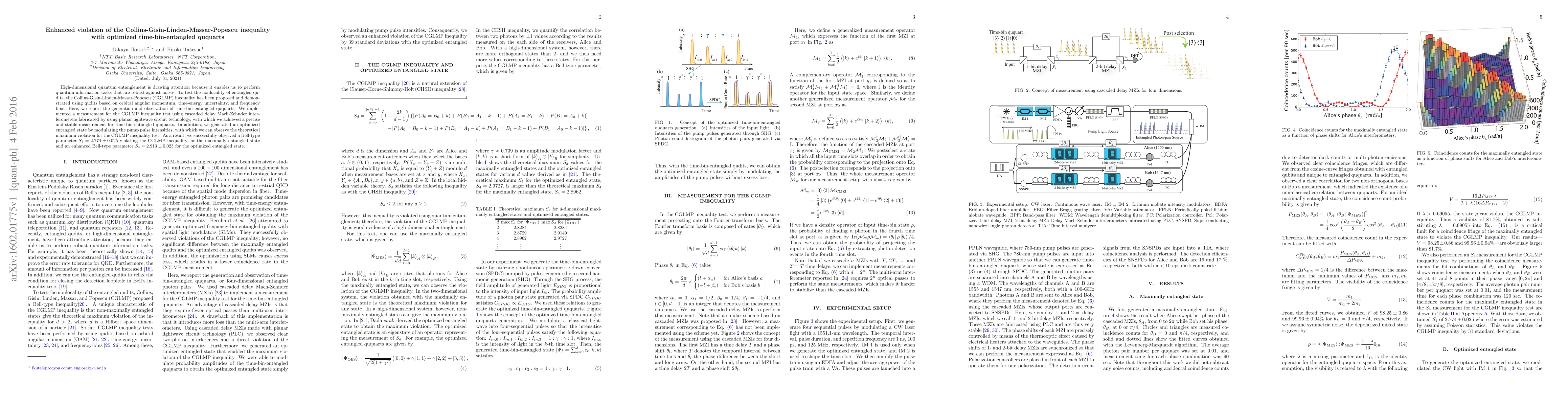 High-dimensional quantum entanglement is drawing attention because it enables us to perform quantum information tasks that are robust against noises. To test the nonlocality of entangled qudits, the Collins-Gisin-Linden-Massar-Popescu (CGLMP) inequality has been proposed and demonstrated using qudits based on orbital angular momentum, time-energy uncertainty, and frequency bins. Here, we report the generation and observation of time-bin entangled ququarts. We implemented a measurement for the CGLMP inequality test using cascaded delay Mach-Zehnder interferometers fabricated by using planar lightwave circuit technology, with which we achieved a precise and stable measurement for time-bin-entangled ququarts. In addition, we generated an optimized entangled state by modulating the pump pulse intensities, with which we can observe the theoretical maximum violation for the CGLMP inequality test. As a result, we successfully observed a Bell-type parameter $S_4 = 2.774 \pm 0.025$ violating the CGLMP inequality for the maximally entangled state and an enhanced Bell-type parameter $S_4 = 2.913 \pm 0.023$ for the optimized entangled state.