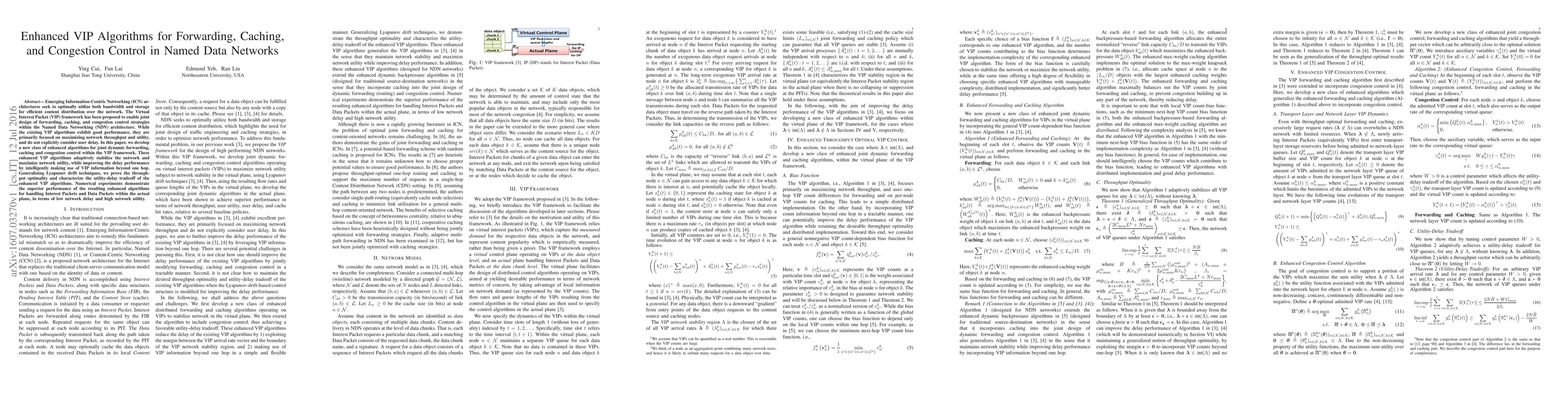 Emerging Information-Centric Networking (ICN) architectures seek to optimally utilize both bandwidth and storage for efficient content distribution over the network. The Virtual Interest Packet (VIP) framework has been proposed to enable joint design of forwarding, caching, and congestion control strategies within the Named Data Networking (NDN) architecture. While the existing VIP algorithms exhibit good performance, they are primarily focused on maximizing network throughput and utility, and do not explicitly consider user delay. In this paper, we develop a new class of enhanced algorithms for joint dynamic forwarding, caching and congestion control within the VIP framework. These enhanced VIP algorithms adaptively stabilize the network and maximize network utility, while improving the delay performance by intelligently making use of VIP information beyond one hop. Generalizing Lyapunov drift techniques, we prove the throughput optimality and characterize the utility-delay tradeoff of the enhanced VIP algorithms. Numerical experiments demonstrate the superior performance of the resulting enhanced algorithms for handling Interest Packets and Data Packets within the actual plane, in terms of low network delay and high network utility.