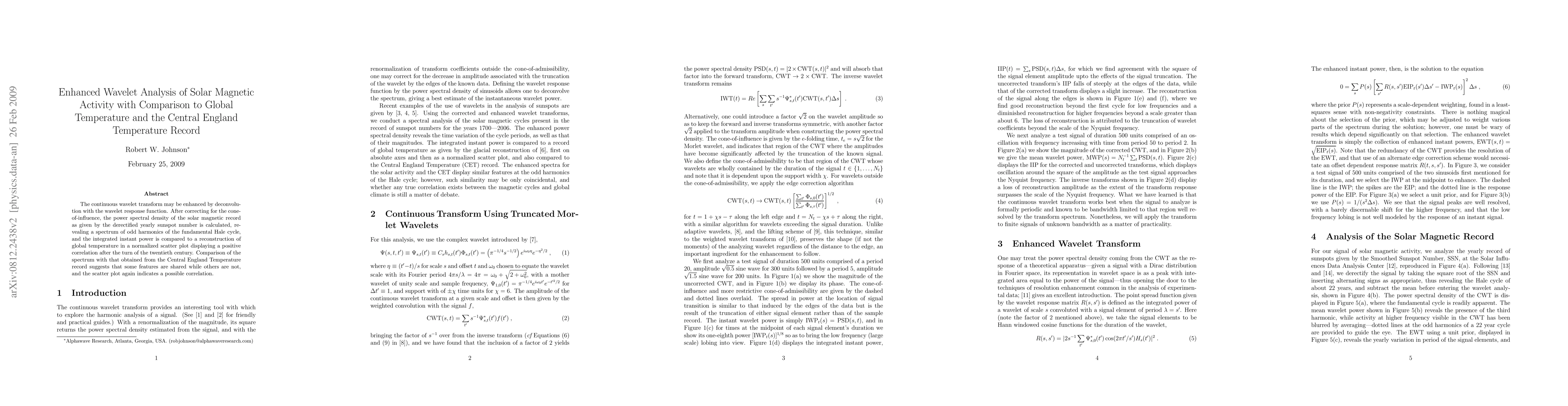 The continuous wavelet transform may be enhanced by deconvolution with the wavelet response function. After correcting for the cone-of-influence, the power spectral density of the solar magnetic record as given by the derectified yearly sunspot number is calculated, revealing a spectrum of odd harmonics of the fundamental Hale cycle, and the integrated instant power is compared to a reconstruction of global temperature in a normalized scatter plot displaying a positive correlation after the turn of the twentieth century. Comparison of the spectrum with that obtained from the Central England Temperature record suggests that some features are shared while others are not, and the scatter plot again indicates a possible correlation.