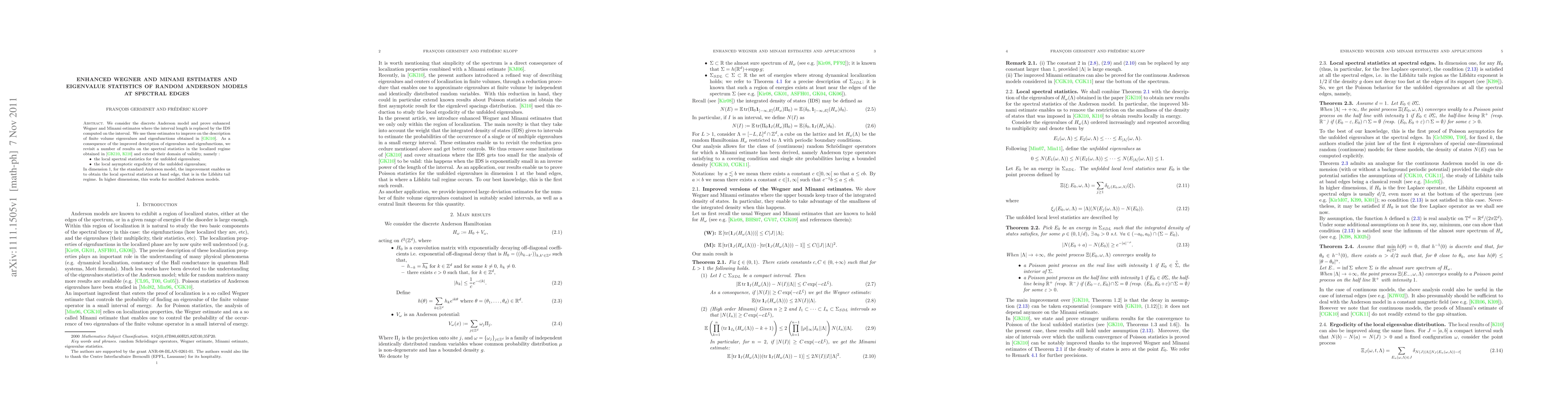 We consider the discrete Anderson model and prove enhanced Wegner and Minami estimates where the interval length is replaced by the IDS computed on the interval. We use these estimates to improve on the description of finite volume eigenvalues and eigenfunctions obtained in a previous paper. As a consequence of the improved description of eigenvalues and eigenfunctions, we revisit a number of results on the spectral statistics in the localized regime and extend their domain of validity, namely : - the local spectral statistics for the unfolded eigenvalues; - the local asymptotic ergodicity of the unfolded eigenvalues; In dimension 1, for the standard Anderson model, the improvement enables us to obtain the local spectral statistics at band edge, that is in the Lifshitz tail regime. In higher dimensions, this works for modified Anderson models.