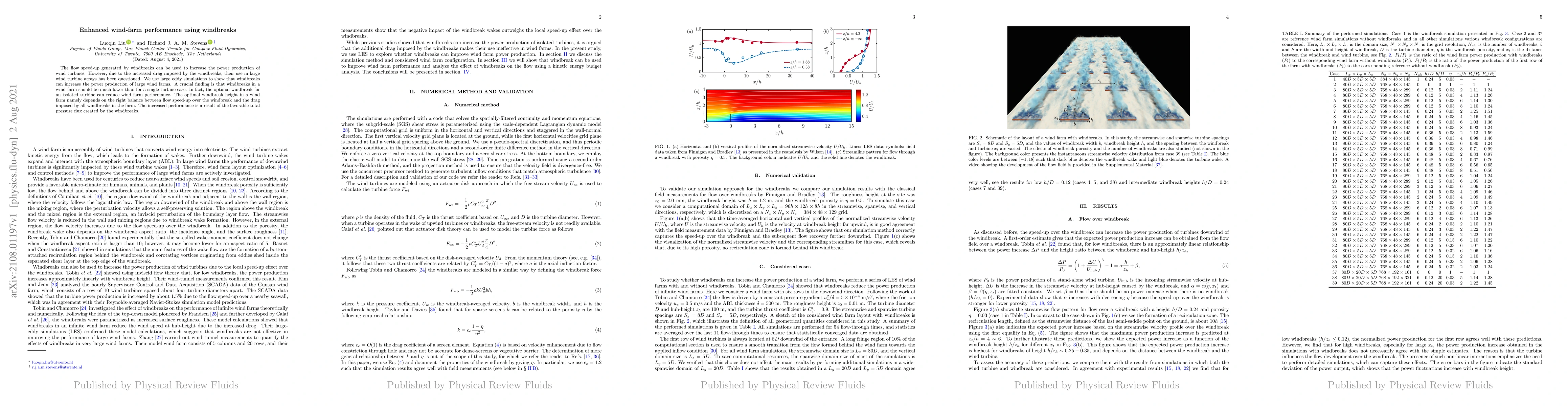 The flow speed-up generated by windbreaks can be used to increase the power production of wind turbines. However, due to the increased drag imposed by the windbreaks, their use in large wind turbine arrays has been questioned. We use large eddy simulations to show that windbreaks can increase the power production of large wind farms. A crucial finding is that windbreaks in a wind farm should be much lower than for a single turbine case. In fact, the optimal windbreak for an isolated turbine can reduce wind farm performance. The optimal windbreak height in a wind farm namely depends on the right balance between flow speed-up over the windbreak and the drag imposed by all windbreaks in the farm. The increased performance is a result of the favorable total pressure flux created by the windbreaks.
