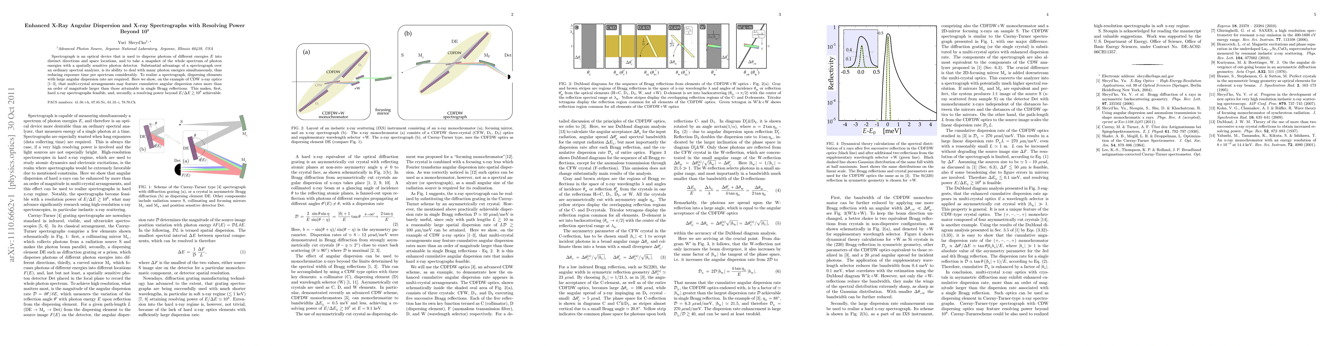 Spectrograph is an optical device that is used to disperse photons of different energies $E$ into distinct directions and space locations, and to take a snapshot of the whole spectrum of photon energies with a spatially sensitive photon detector. Substantial advantage of a spectrograph over an ordinary spectral analyzer, is its ability to deal with many photon energies simultaneously, thus reducing exposure time per spectrum considerably. To realize a spectrograph, dispersing elements with large angular dispersion rate are required. Here we show, on the example of CDW x-ray optics [1-3], that multi-crystal arrangements may feature cumulative angular dispersion rates more than an order of magnitude larger than those attainable in single Bragg reflections. This makes, first, hard x-ray spectrographs feasible, and, secondly, a resolving power beyond $E/\Delta E \gtrsim 10^{8}$ achievable.