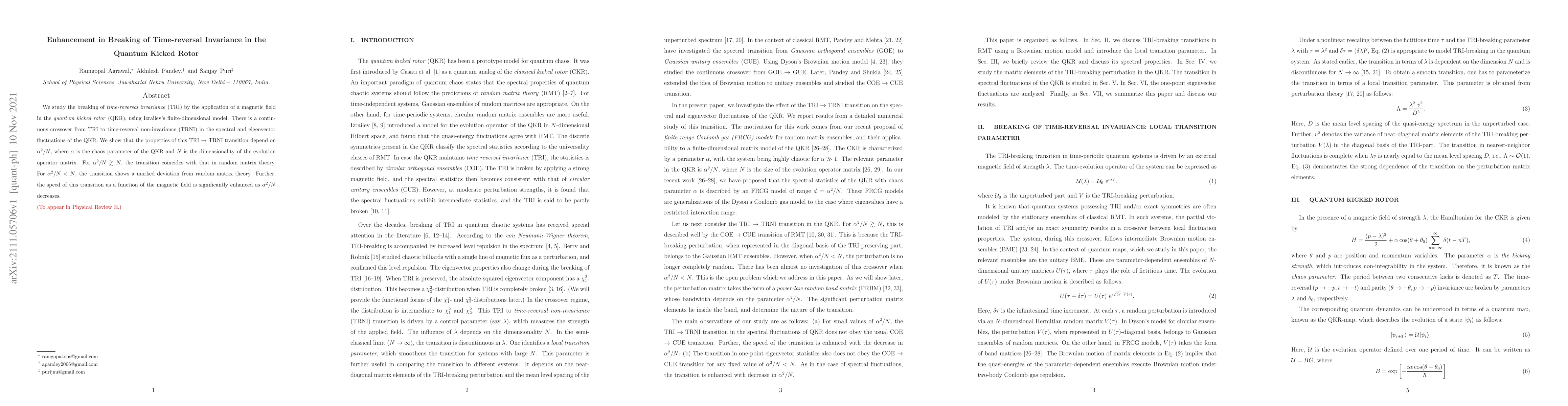 This paper investigates the transition from time-reversal invariance to time-reversal non-invariance in the quantum kicked rotor under a magnetic field, revealing a dependence on the ratio $\alpha^2/N$. The transition exhibits deviations from random matrix theory when $\alpha^2/N < N$, with a notable enhancement in speed as this ratio decreases.