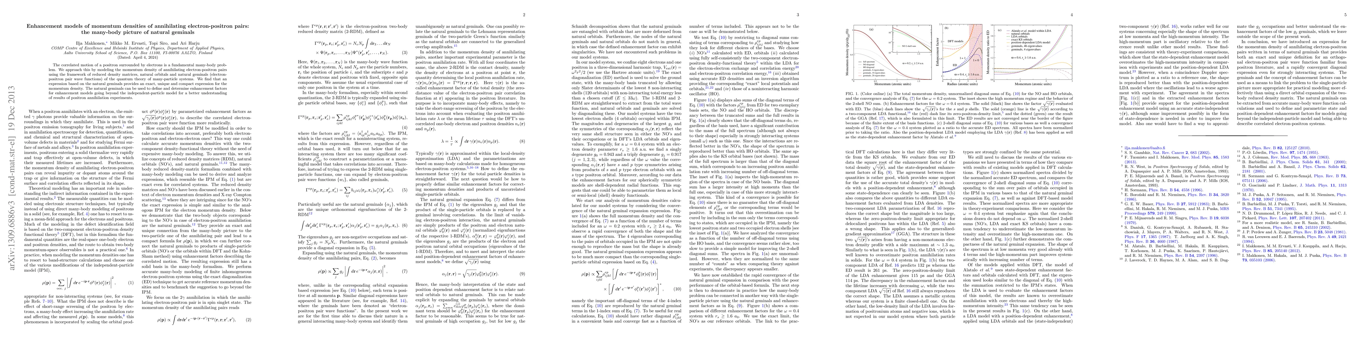 This paper explores the correlated motion of a positron surrounded by electrons using natural geminals within the quantum theory of many-particle systems. It presents an exact expression for the momentum density of annihilating electron-positron pairs, offering enhancement factors that improve upon the independent-particle model for positron annihilation experiments.