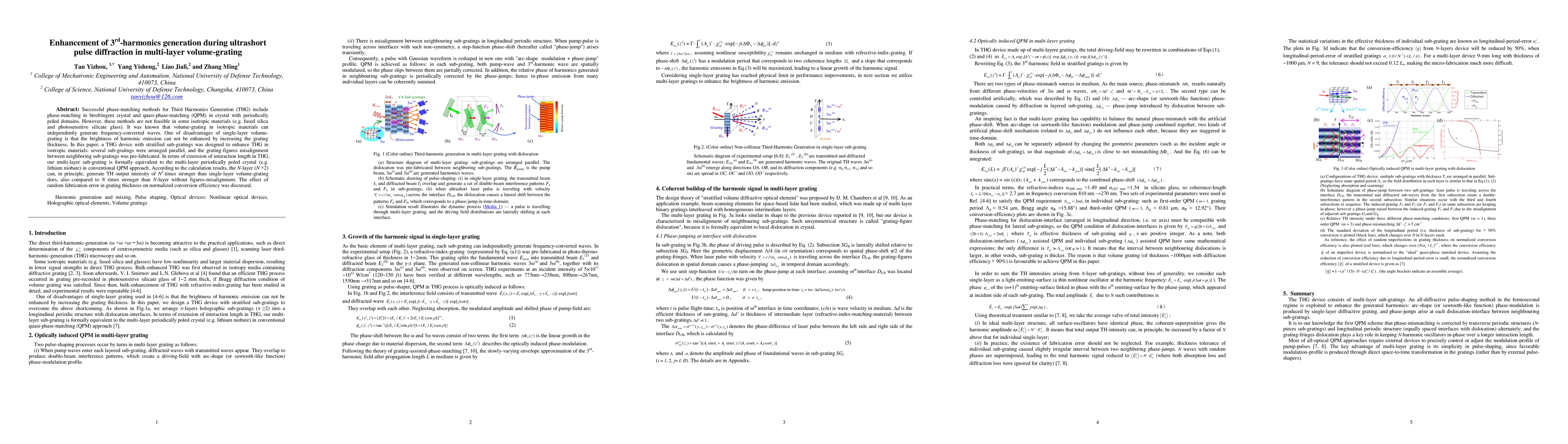 This research presents a novel method to enhance Third Harmonics Generation (THG) in isotropic materials, like fused silica and silicate glass, by employing a multi-layer volume-grating structure. The design consists of several parallel sub-gratings with pre-fabricated grating-figures misalignment, effectively extending interaction length and increasing THG output intensity up to N*N times that of a single-layer volume-grating, where N is the number of layers. The study also examines the impact of random fabrication errors on conversion efficiency.