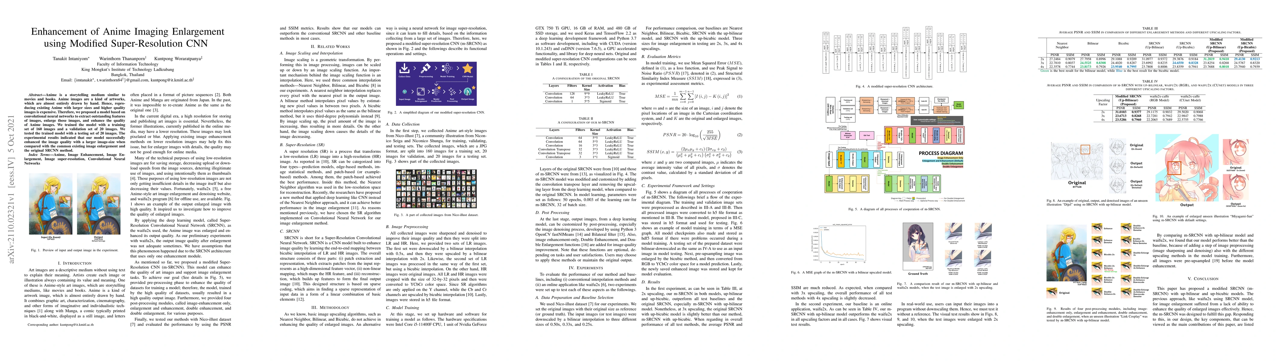 This paper proposes a modified convolutional neural network (CNN) model to enhance the enlargement and quality of anime images, trained on 160 images and validated with 20 images. Experimental results show improved quality and larger sizes compared to existing super-resolution methods.