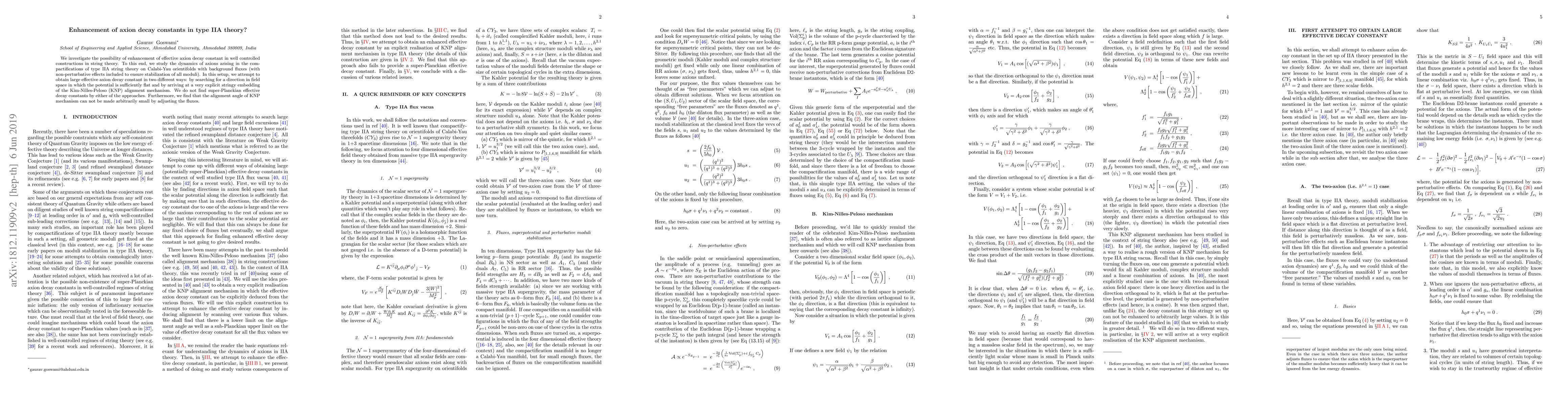 This paper explores methods to enhance the effective axion decay constant in type IIA string theory using Calabi-Yau orientifold compactifications with background fluxes. Despite attempts through flat potential directions and explicit KNP alignment mechanisms, the study finds no super-Planckian decay constants and concludes that the KNP alignment angle cannot be made arbitrarily small.