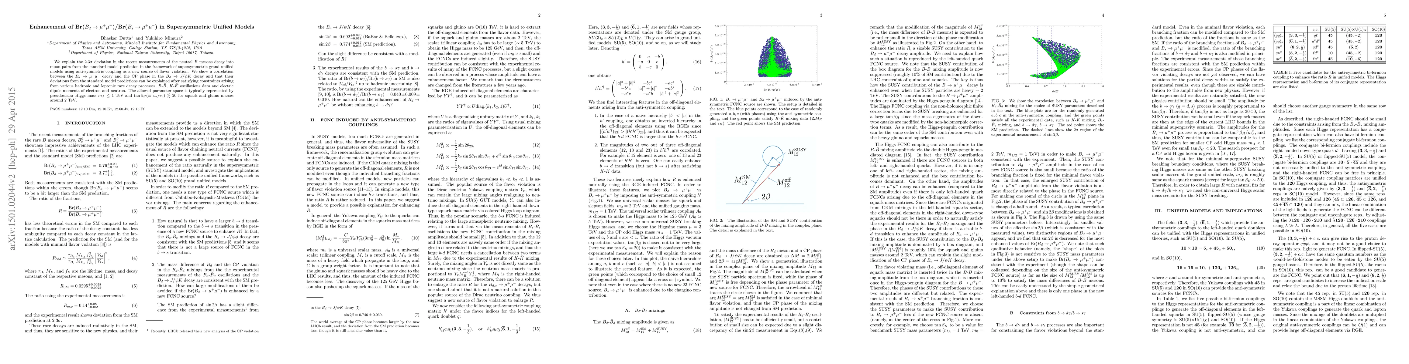 This paper explores how supersymmetric grand unified models with anti-symmetric coupling can explain a 2.3 sigma deviation in neutral B meson decay into muon pairs, correlating it with the CP phase in B_d -> J/psi K decay. The allowed parameter space satisfies constraints from various decay processes and oscillation data, with pseudoscalar Higgs mass m_A < 1 TeV and tan beta_H < 20 for squark and gluino masses around 2 TeV.