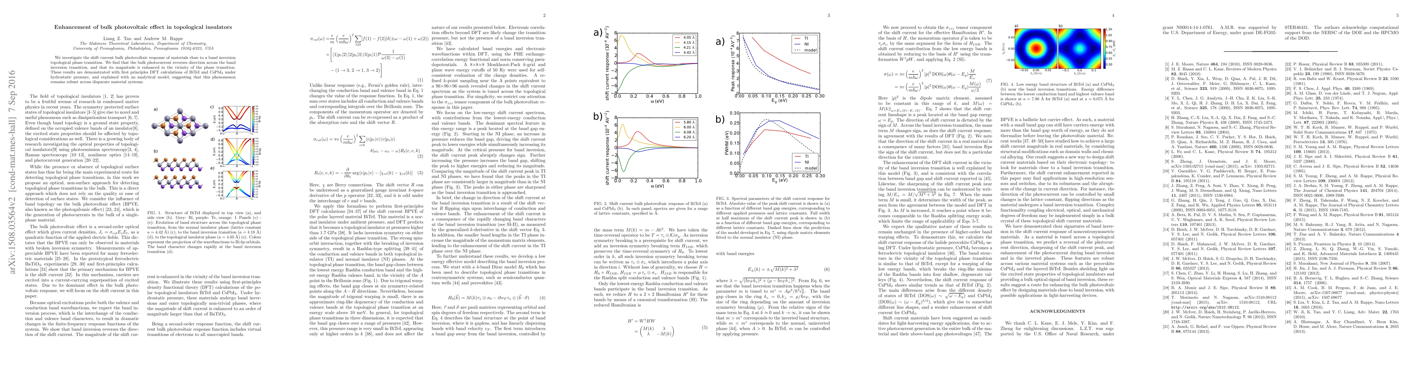 This study reveals that the bulk photovoltaic effect in topological insulators is significantly enhanced near a band inversion transition, with the photocurrent direction reversing across this transition. First principles calculations and an analytical model demonstrate this phenomenon in BiTeI and CsPbI$_3$, suggesting its robustness across different material systems.