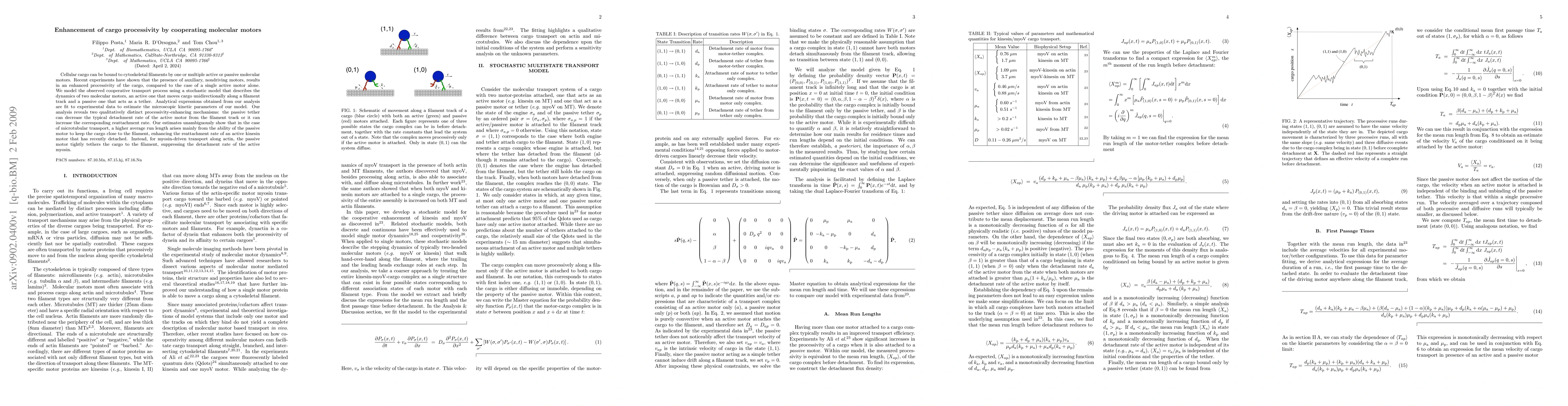 This paper models cooperative transport by two molecular motors, showing that auxiliary passive motors enhance cargo processivity. The study identifies two mechanisms: passive motors either increase reattachment rates or decrease detachment rates of active motors, with different mechanisms dominating in microtubule and actin transport systems.