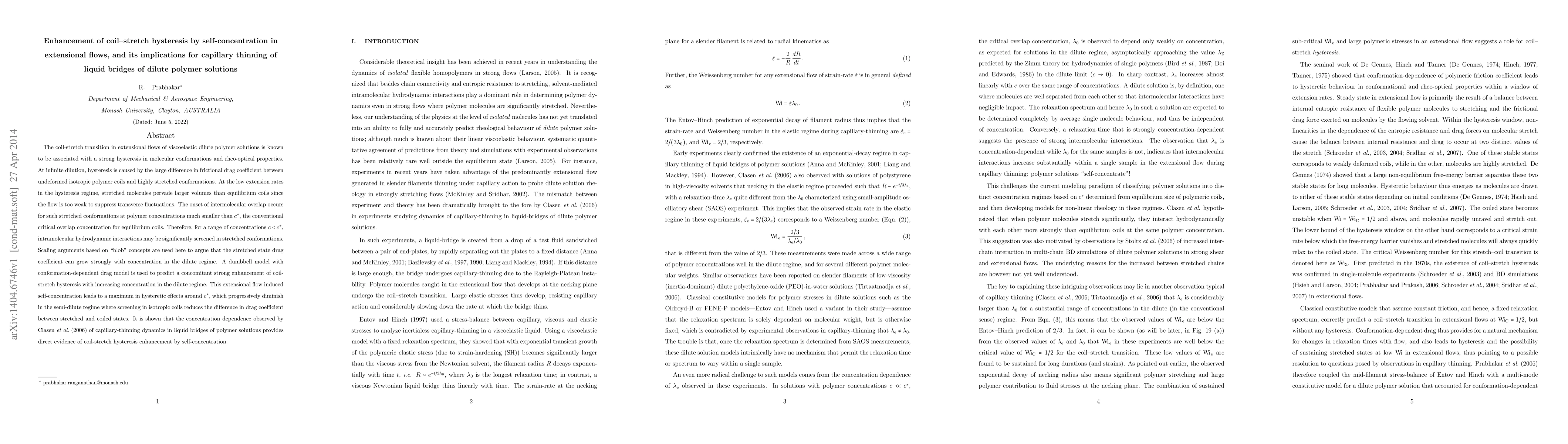 This paper investigates the enhancement of coil-stretch hysteresis in extensional flows of dilute polymer solutions, attributing it to self-concentration effects. The study demonstrates that this hysteresis leads to significant implications for the capillary thinning dynamics of liquid bridges, confirming the observed concentration dependence in polymer solution behavior.
