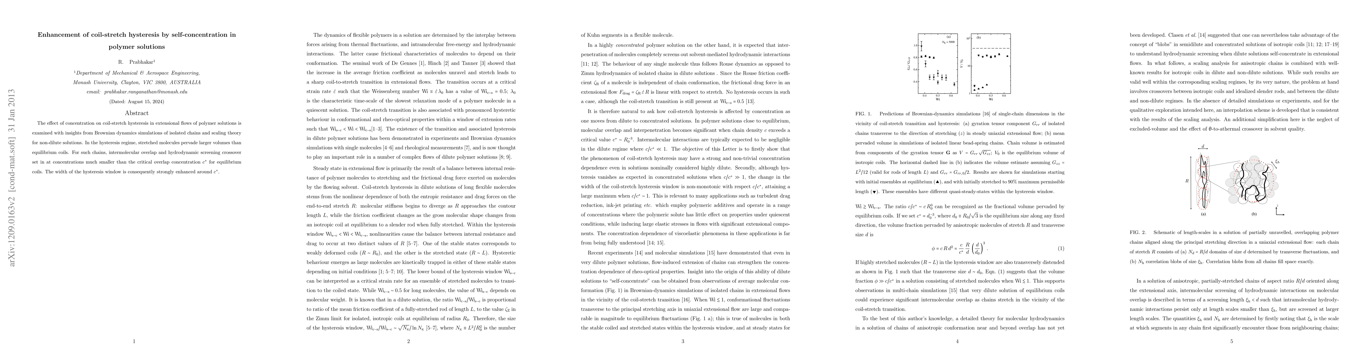 This study investigates how concentration influences coil-stretch hysteresis in polymer solutions using Brownian dynamics simulations and scaling theory. The findings reveal that stretched molecules occupy larger volumes than equilibrium coils, leading to enhanced hysteresis width near the critical overlap concentration.