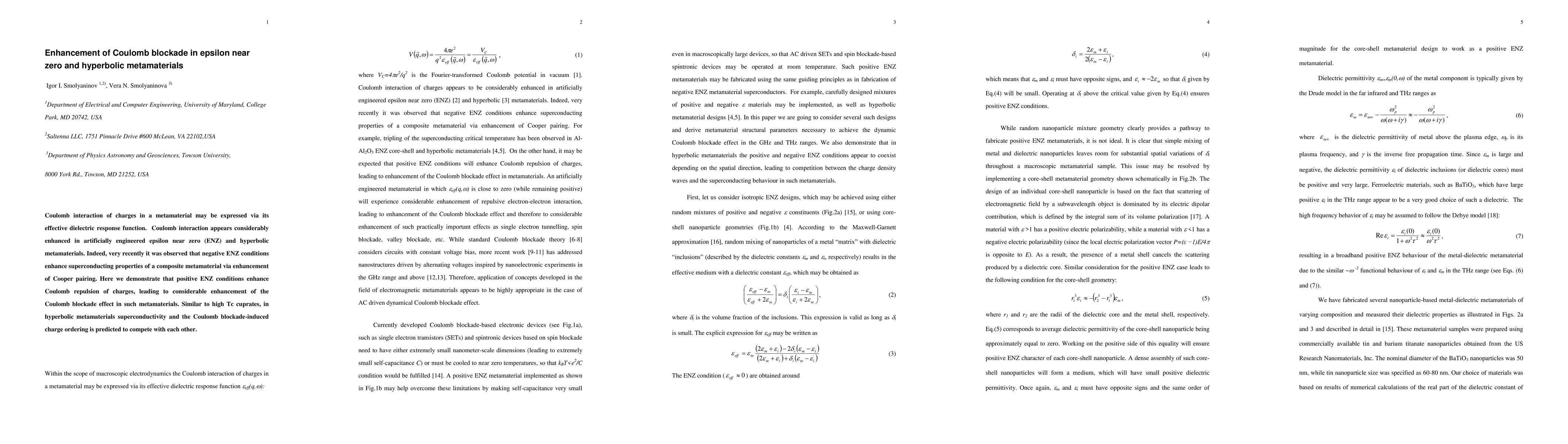 This research demonstrates that epsilon near zero (ENZ) and hyperbolic metamaterials significantly enhance Coulomb blockade effects by amplifying Coulomb repulsion. This enhancement is analogous to the competing effects between superconductivity and Coulomb blockade observed in high Tc cuprates.