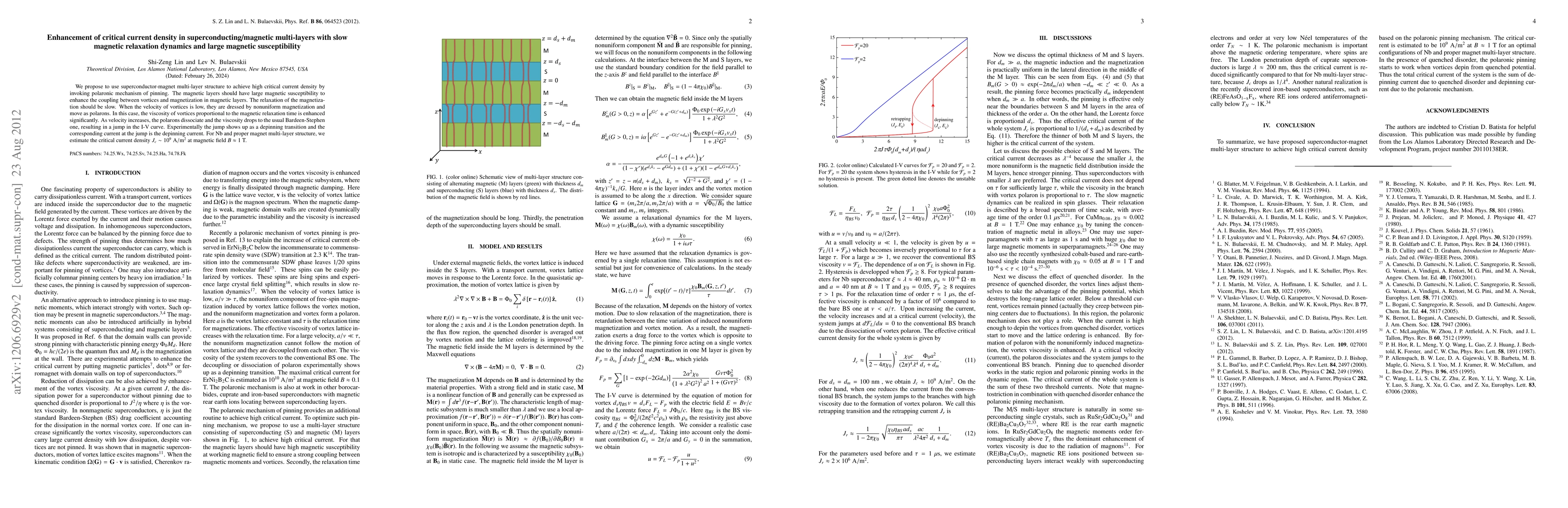 We propose to use superconductor-magnet multi-layer structure to achieve high critical current density by invoking polaronic mechanism of pinning. The magnetic layers should have large magnetic susceptibility to enhance the coupling between vortices and magnetization in magnetic layers. The relaxation of the magnetization should be slow. When the velocity of vortices is low, they are dressed by nonuniform magnetization and move as polarons. In this case, the viscosity of vortices proportional to the magnetic relaxation time is enhanced significantly. As velocity increases, the polarons dissociate and the viscosity drops to the usual Bardeen-Stephen one, resulting in a jump in the I-V curve. Experimentally the jump shows up as a depinning transition and the corresponding current at the jump is the depinning current. For Nb and proper magnet multi-layer structure, we estimate the critical current density $J_c\sim 10^{9}\ \rm{A/m^2}$ at magnetic field $B\approx 1$ T.