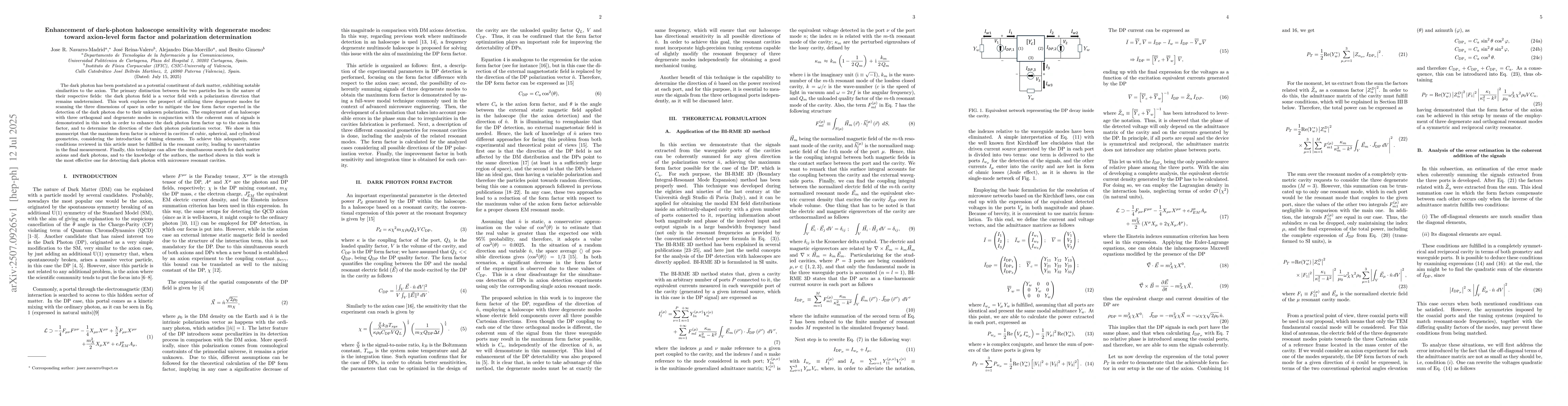 The dark photon has been postulated as a potential constituent of dark matter, exhibiting notable similarities to the axion. The primary distinction between the two particles lies in the nature of their respective fields: the dark photon field is a vector field with a polarization direction that remains undetermined. This work explores the prospect of utilizing three degenerate modes for scanning the three dimensions of space in order to mitigate the low form factor expected in the detection of the dark photon due to their unknown polarization. The employment of an haloscope with three orthogonal and degenerate modes in conjunction with the coherent sum of signals is demonstrated in this work in order to enhance the dark photon form factor up to the axion form factor, and to determine the direction of the dark photon polarization vector. We show in this manuscript that the maximum form factor is achieved in cavities of cubic, spherical, and cylindrical geometries, considering the introduction of tuning elements. To achieve this adequately, some conditions reviewed in this article must be fulfilled in the resonant cavity, leading to uncertainties in the final measurement. Finally, this technique can allow the simultaneous search for dark matter axions and dark photons, and to the knowledge of the authors, the method shown in this work is the most effective one for detecting dark photon with microwave resonant cavities.