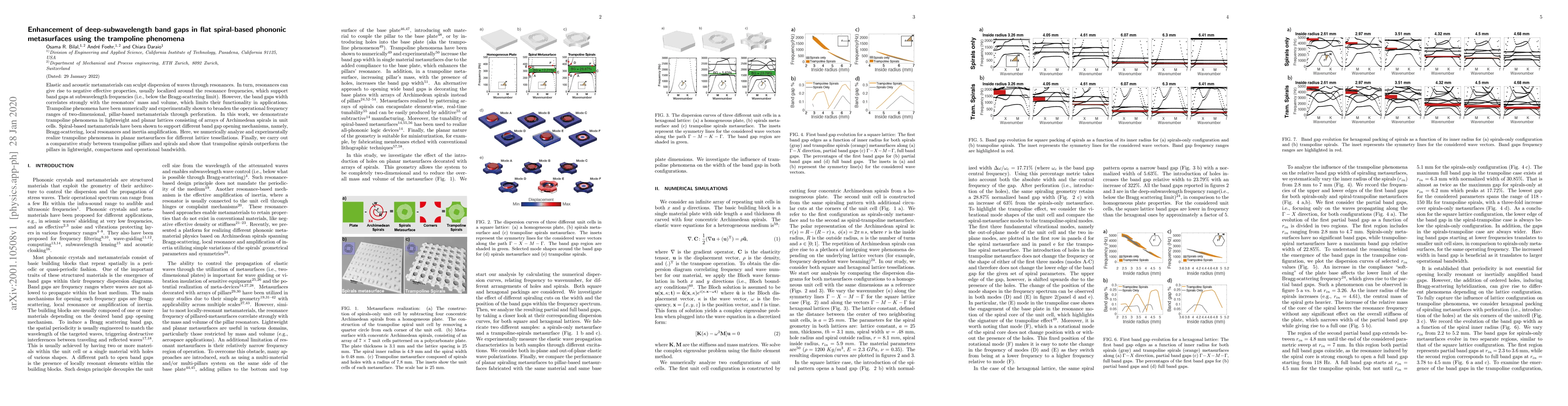 This paper investigates the enhancement of deep-subwavelength band gaps in planar phononic metasurfaces using Archimedean spirals and the trampoline phenomena. The study demonstrates that trampoline spirals outperform traditional pillars in terms of lightweight, compactness, and operational bandwidth.