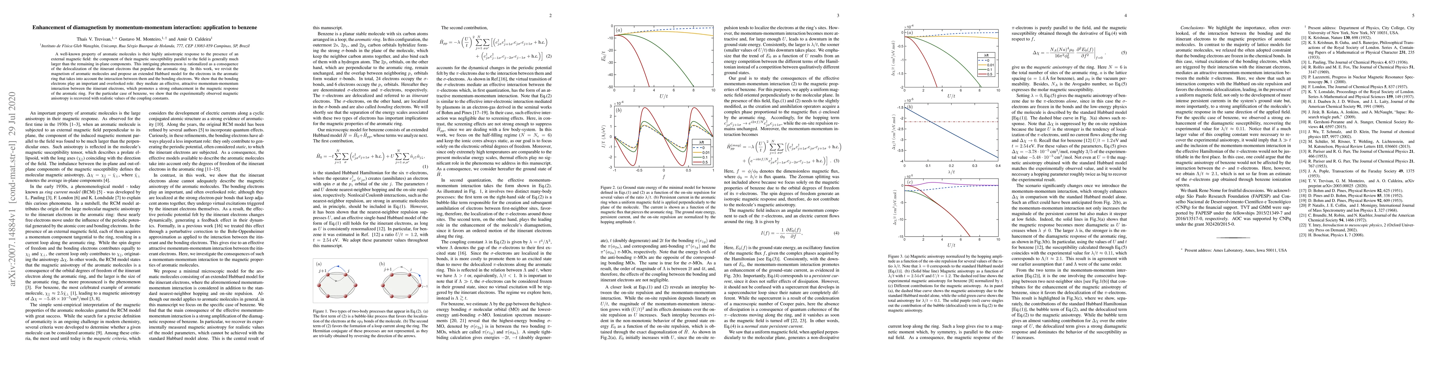 A well-known property of aromatic molecules is their highly anisotropic response to the presence of an external magnetic field: the component of their magnetic susceptibility parallel to the field is generally much larger than the remaining in-plane components. This intriguing phenomenon is rationalized as a consequence of the delocalization of the itinerant electrons that populate the aromatic ring. In this work, we revisit the magnetism of aromatic molecules and propose an extended Hubbard model for the electrons in the aromatic ring that takes into account the interaction between them and the bonding electrons. We show that the bonding electrons play an important and overlooked role: they mediate an effective, attractive momentum-momentum interaction between the itinerant electrons, which promotes a strong enhancement in the magnetic response of the aromatic ring. For the particular case of benzene, we show that the experimentally observed magnetic anisotropy is recovered with realistic values of the coupling constants.