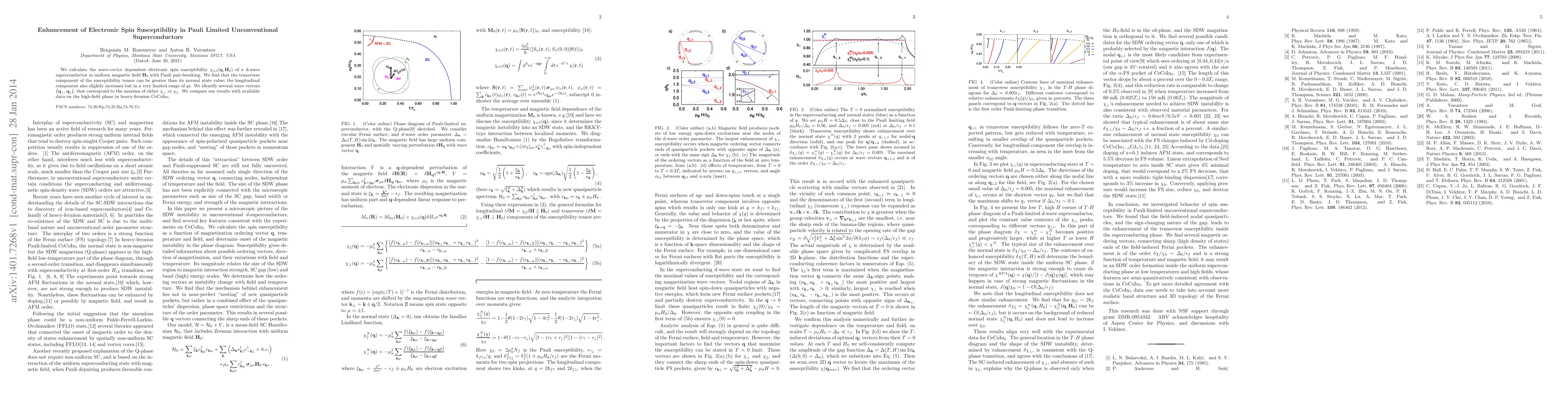 We calculate the wave-vector dependent electronic spin susceptibility $\chi_{\alpha\beta}(\mathbf q, \mathbf H_0)$ of a d-wave superconductor in uniform magnetic field $\mathbf{H}_0$ with Pauli pair-breaking. We find that the transverse component of the susceptibility tensor can be greater than its normal state value; the longitudinal component also slightly increases but in a very limited range of $q$s. We identify several wave vectors $\{\mathbf q_\perp,\mathbf q_\parallel\}$, that correspond to the maxima of either $\chi_\perp$ or $\chi_\parallel$. We compare our results with available data on the high-field phase in heavy-fermion CeCoIn$_5$.