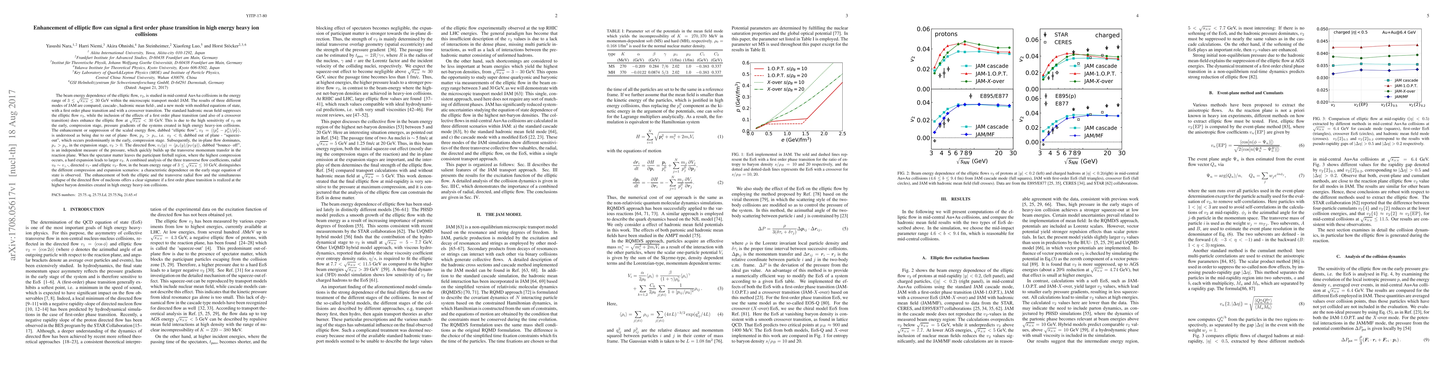 The beam energy dependence of the elliptic flow,$v_2$, is studied in mid-central Au+Au collisions in the energy range of $3\leq \sqrt{s_{NN}} \leq 30$ GeV within the microscopic transport model JAM. The results of three different modes of JAM are compared; cascade-,hadronic mean field-, and a new mode with modified equations of state, with a first order phase transition (1.O.P.T.) and with a crossover transition. The standard hadronic mean field suppresses $v_2$, while the inclusion of the effects of a 1.O.P.T. (and also of a crossover transition) does enhance $v_2$ at $\sqrt{s_{NN}}<30$ GeV. The enhancement or suppression of the scaled energy flow, dubbed "elliptic flow"is understood as being due to out of plane- flow, i.e. $v_2<0$, dubbed out of plane - "squeeze-out", which occurs predominantly in the early, compression stage. Subsequently, the in-plane flow dominates, in the expansion stage, $v_2 > 0$. The directed flow, dubbed "bounce- off", is an independent measure of the pressure, which quickly builds up the transverse momentum transfer in the reaction plane. When the spectator matter leaves the participant fireball region, where the highest compression occurs, a hard expansion leads to larger $v_2$. A combined analysis of the three transverse flow coefficients, radial $v_0$-, directed $v_1$- and elliptic $v_2$- flow, in the beam energy range of $3\leq\sqrt{s_{NN}}\leq10$ GeV, distinguishes the different compression and expansion scenarios: a characteristic dependence on the early stage equation of state is observed. The enhancement of both the elliptic and the transverse radial flow and the simultaneous collapse of the directed flow of nucleons offers a clear signature if 1.O.P.T. is realized at the highest baryon densities created in high energy heavy-ion collisions.