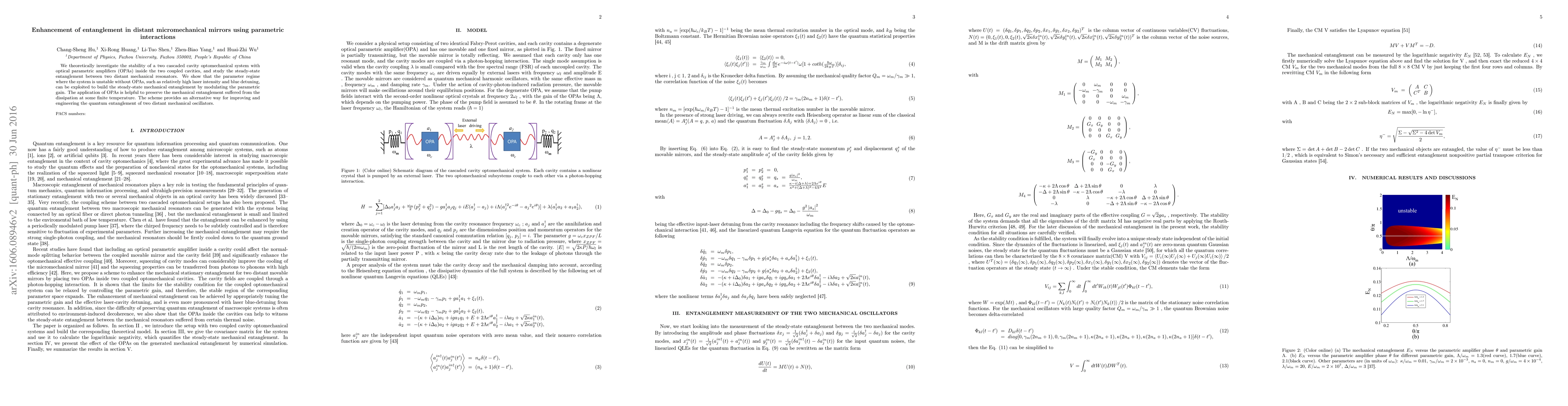 This paper explores a two-cascaded optomechanical system with optical parametric amplifiers to enhance entanglement between distant micromechanical resonators. By modulating parametric gain, it demonstrates stable mechanical entanglement even under unstable conditions, offering a method to improve quantum entanglement in mechanical systems.