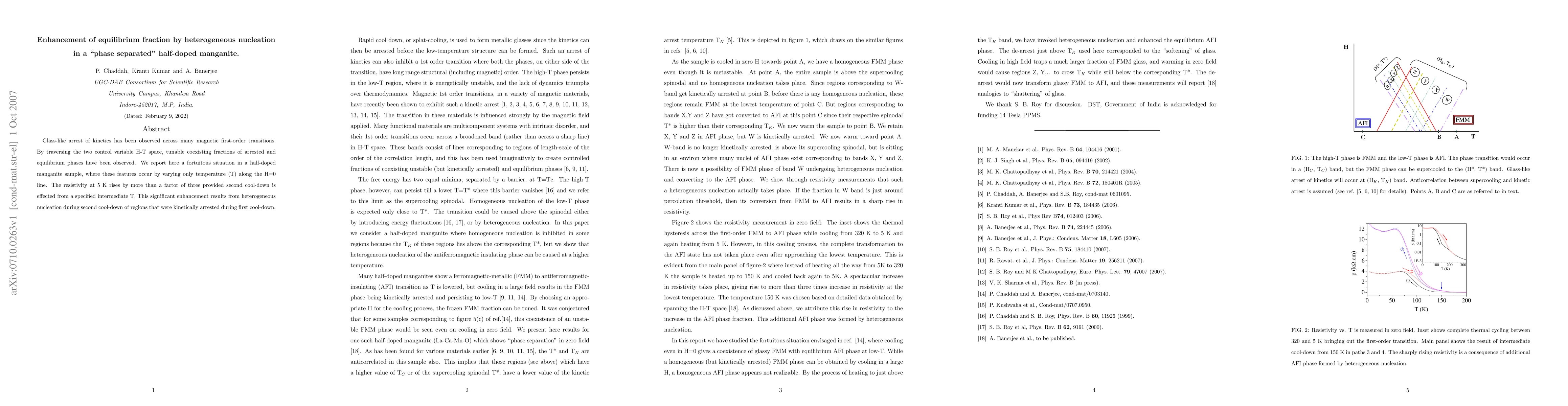 Glass-like arrest of kinetics has been observed across many magnetic first-order transitions. By traversing the two control variable H-T space, tunable coexisting fractions of arrested and equilibrium phases have been observed. We report here a fortuitous situation in a half-doped manganite sample, where these features occur by varying only temperature (T) along the H=0 line. The resistivity at 5 K rises by more than a factor of three provided second cool-down is effected from a specified intermediate T. This significant enhancement results from heterogeneous nucleation during second cool-down of regions that were kinetically arrested during first cool-down.