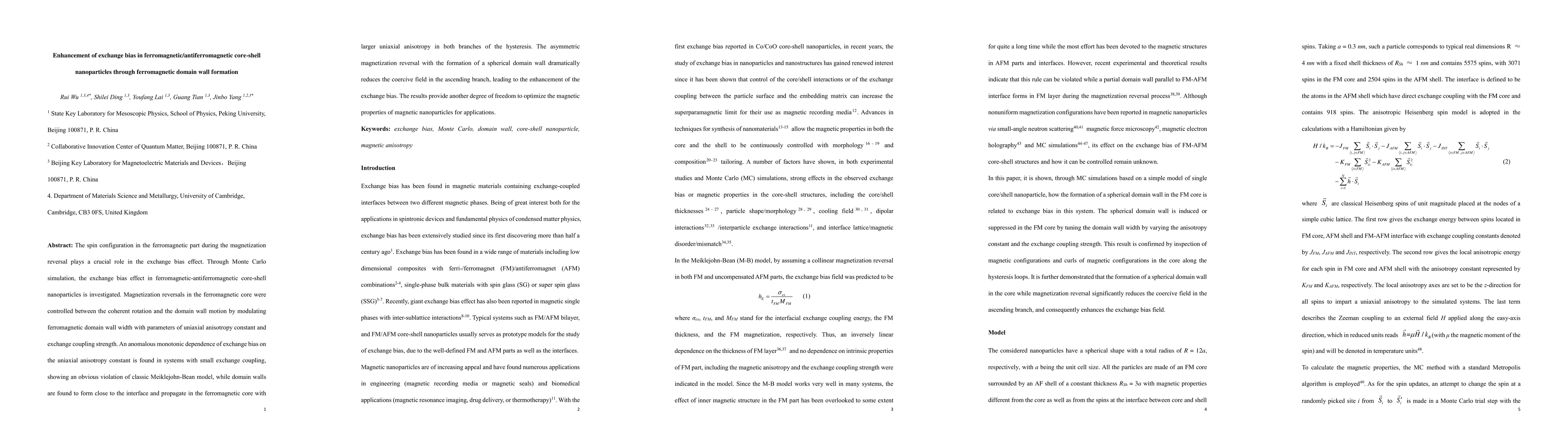 This paper investigates the enhancement of exchange bias in core-shell nanoparticles via ferromagnetic domain wall formation, revealing that domain wall motion significantly reduces coercive fields and enhances the exchange bias effect, challenging the classic Meiklejohn-Bean model. The study uses Monte Carlo simulations to explore the impact of uniaxial anisotropy and exchange coupling on magnetization reversal.