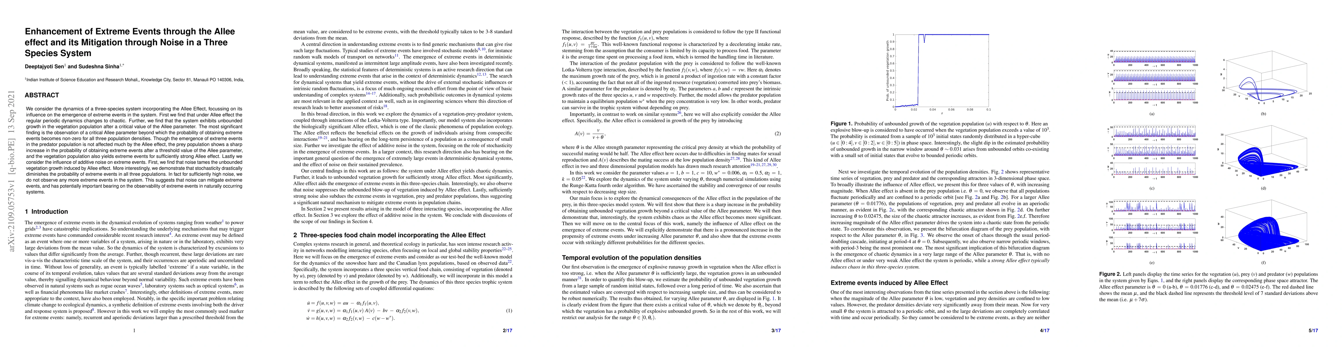 The study analyzes a three-species system incorporating the Allee effect, focusing on its influence on extreme events. It employs numerical simulations and stochastic differential equations to model the system under deterministic and noisy conditions.