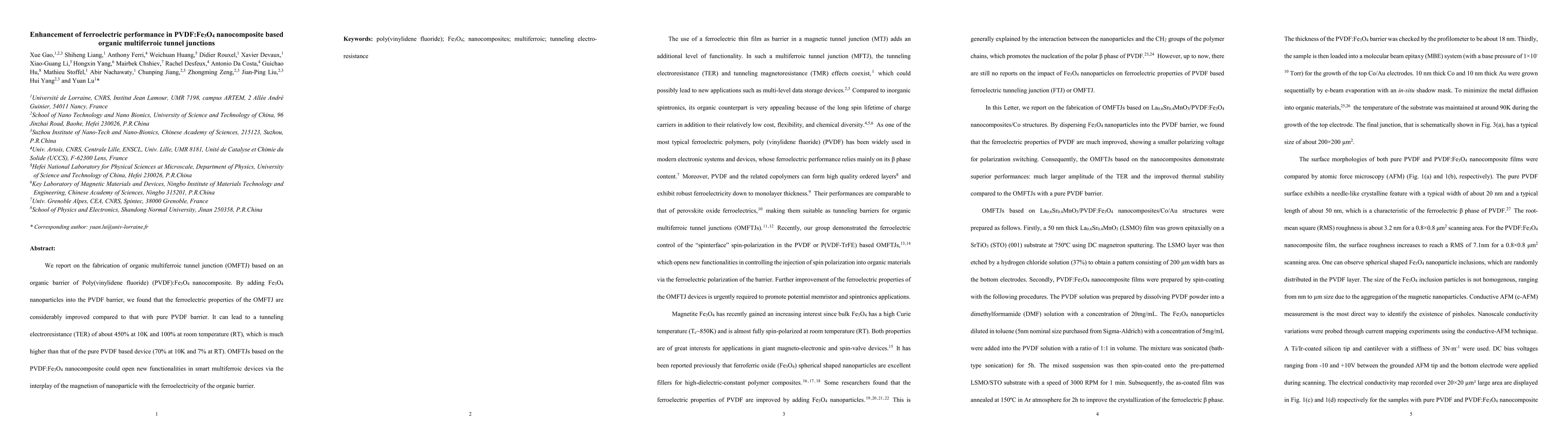 This paper reports the enhancement of ferroelectric performance in organic multiferroic tunnel junctions (OMFTJs) by incorporating Fe3O4 nanoparticles into a Poly(vinylidene fluoride) (PVDF) barrier, resulting in significantly improved tunneling electroresistance compared to pure PVDF devices.