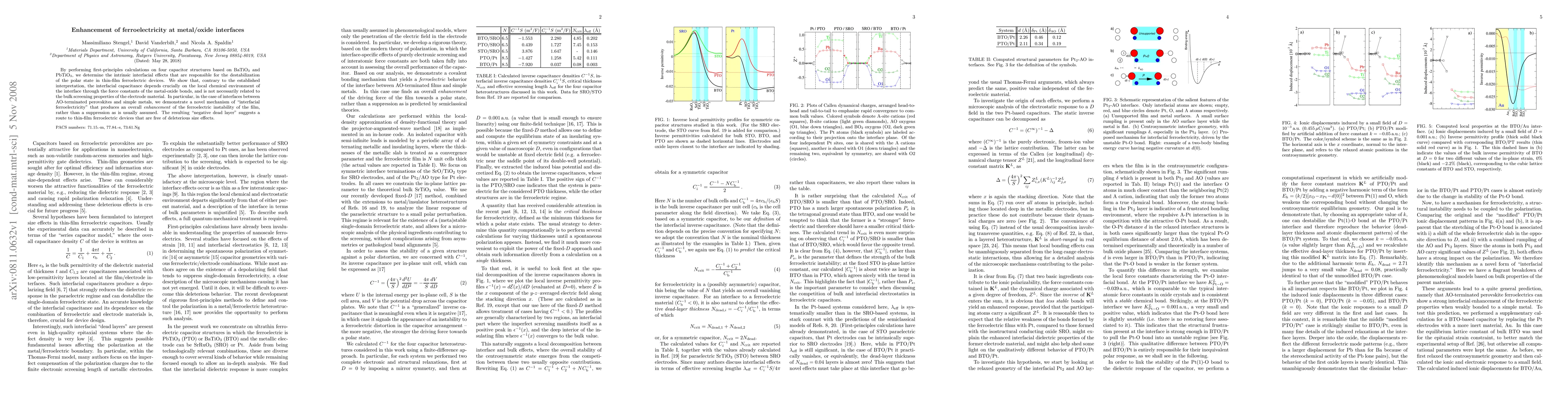 By performing first-principles calculations on four capacitor structures based on BaTiO3 and PbTiO3, we determine the intrinsic interfacial effects that are responsible for the destabilization of the polar state in thin-film ferroelectric devices. We show that, contrary to the established interpretation, the interfacial capacitance depends crucially on the local chemical environment of the interface through the force constants of the metal-oxide bonds, and is not necessarily related to the bulk screening properties of the electrode material. In particular, in the case of interfaces between AO-terminated perovskites and simple metals, we demonstrate a novel mechanism of "interfacial ferroelectricity" that produces an overall enhancement of the ferroelectric instability of the film, rather than a suppression as is usually assumed. The resulting "negative dead layer" suggests a route to thin-film ferroelectric devices that are free of deleterious size effects.