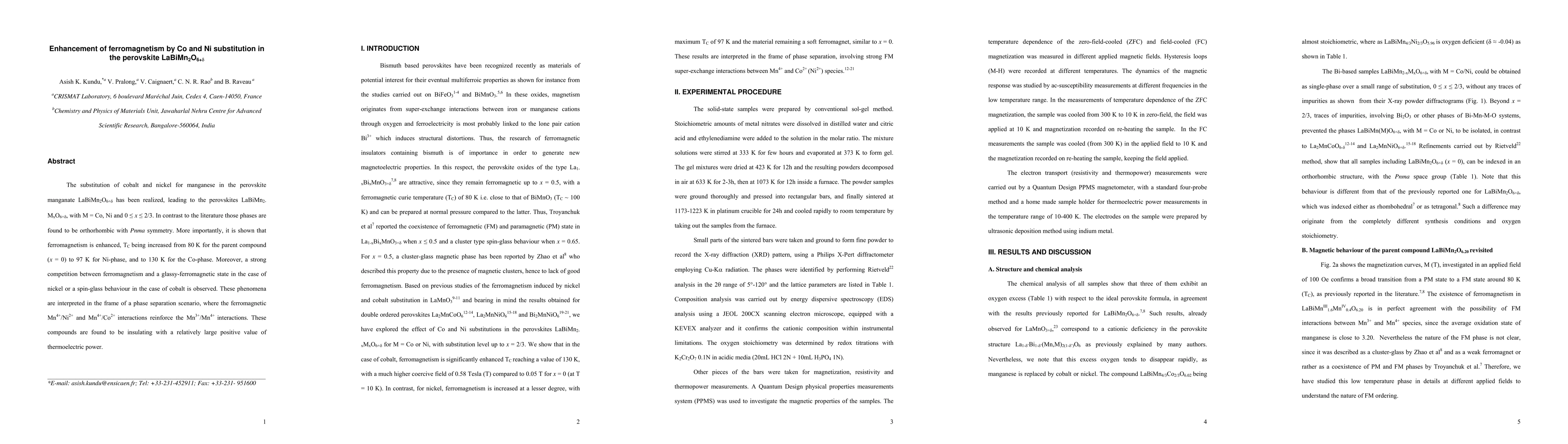 The substitution of cobalt and nickel for manganese in the perovskite manganate LaBiMn2O6+d; has been realized, leading to the perovskites LaBiMn2-x(M)xO6+d, with M = Co, Ni and x =0-2/3. In contrast to the literature those phases are found to be orthorhombic with Pnma symmetry. More importantly, it is shown that ferromagnetism is enhanced, TC being increased from 80 K for the parent compound (x = 0) to 97 K for Ni-phase, and to 130 K for the Co-phase. Moreover, a strong competition between ferromagnetism and a glassy-ferromagnetic state in the case of nickel or a spin-glass behaviour in the case of cobalt is observed. These phenomena are interpreted in the frame of a phase separation scenario, where the ferromagnetic Mn4+/Ni2+ and Mn4+/Co2+ interactions reinforce the Mn3+/Mn4+ interactions. These compounds are found to be insulating with a relatively large positive value of thermoelectric power.