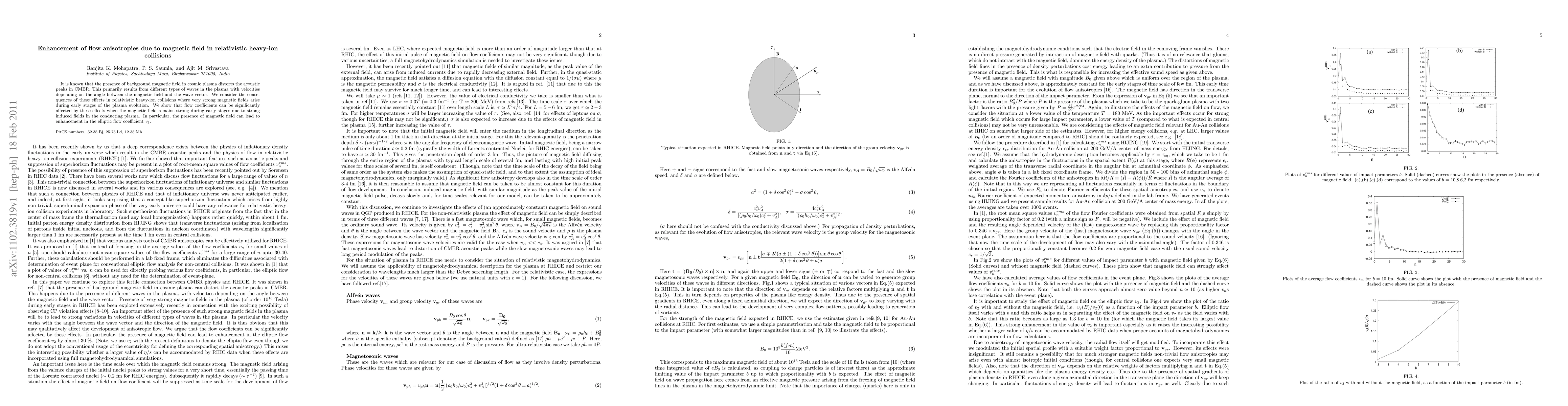 It is known that the presence of background magnetic field in cosmic plasma distorts the acoustic peaks in CMBR. This primarily results from different types of waves in the plasma with velocities depending on the angle between the magnetic field and the wave vector. We consider the consequences of these effects in relativistic heavy-ion collisions where very strong magnetic fields arise during early stages of the plasma evolution. We show that flow coefficients can be significantly affected by these effects when the magnetic field remains strong during early stages due to strong induced fields in the conducting plasma. In particular, the presence of magnetic field can lead to enhancement in the elliptic flow coefficient $v_2$.