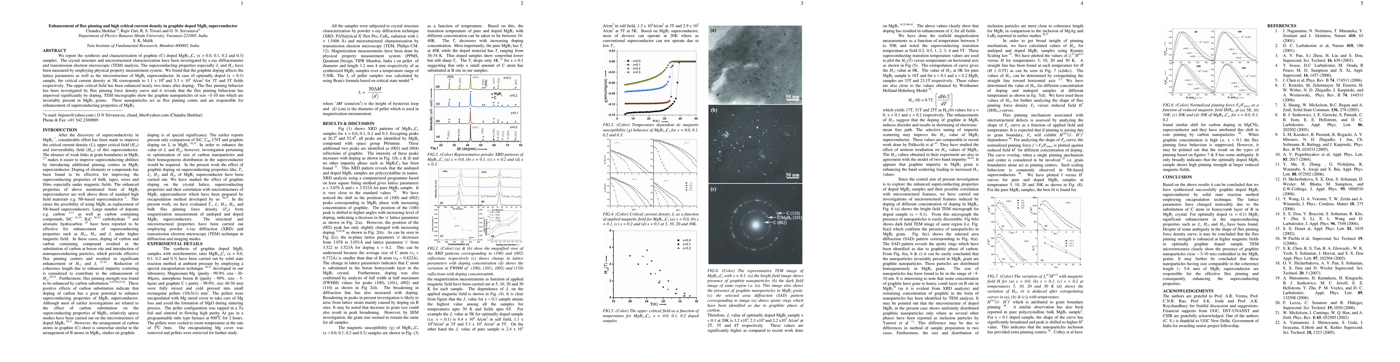 This study synthesizes and characterizes graphite-doped MgB2 superconductors, finding that optimal doping (x=0.1) significantly enhances critical current density and flux pinning behavior, attributed to the presence of ~5-10 nm graphite nanoparticles within MgB2 grains.
