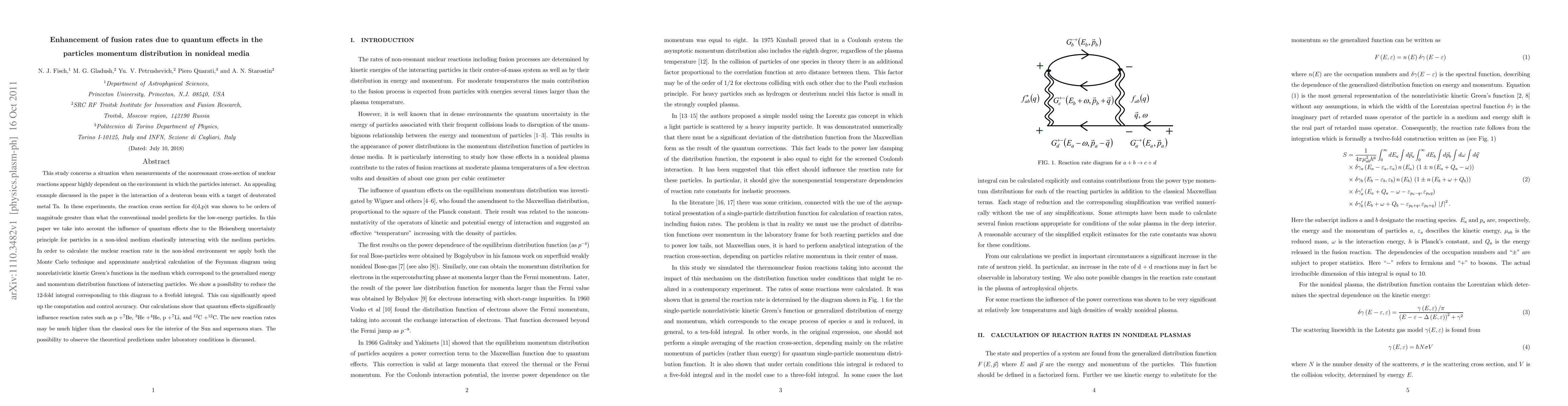 This study concerns a situation when measurements of the nonresonant cross-section of nuclear reactions appear highly dependent on the environment in which the particles interact. An appealing example discussed in the paper is the interaction of a deuteron beam with a target of deuterated metal Ta. In these experiments, the reaction cross section for d(d,p)t was shown to be orders of magnitude greater than what the conventional model predicts for the low-energy particles. In this paper we take into account the influence of quantum effects due to the Heisenberg uncertainty principle for particles in a non-ideal medium elastically interacting with the medium particles. In order to calculate the nuclear reaction rate in the non-ideal environment we apply both the Monte Carlo technique and approximate analytical calculation of the Feynman diagram using nonrelativistic kinetic Green's functions in the medium which correspond to the generalized energy and momentum distribution functions of interacting particles. We show a possibility to reduce the 12-fold integral corresponding to this diagram to a fivefold integral. This can significantly speed up the computation and control accuracy. Our calculations show that quantum effects significantly influence reaction rates such as p +7Be, 3He +4He, p +7Li, and 12C +12C. The new reaction rates may be much higher than the classical ones for the interior of the Sun and supernova stars. The possibility to observe the theoretical predictions under laboratory conditions is discussed.