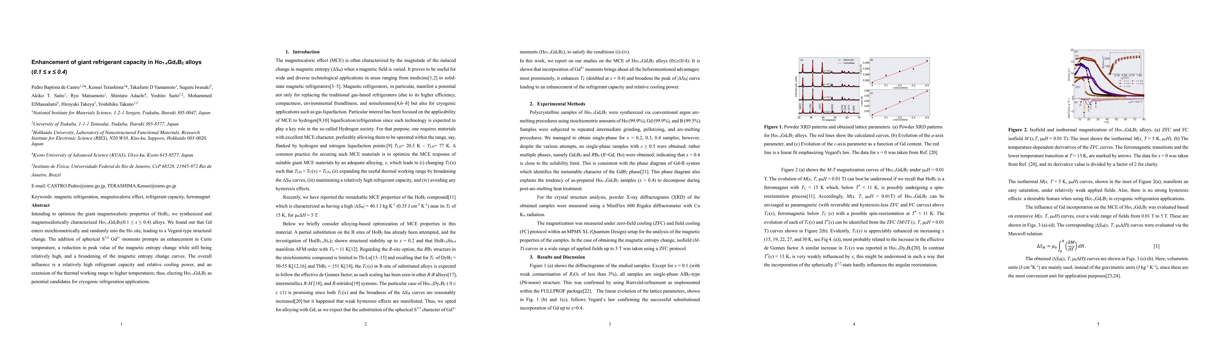 Intending to optimize the giant magnetocaloric properties of HoB$_{2}$, we synthesized and magnetocalorically characterized Ho$_{1-x}$Gd$_{x}$B$_{2}$(0.1 $\leq$ x $\leq$ 0.4) alloys. We found out that Gd enters stoichiometrically and randomly into the Ho site, leading to a Vegard-type structural change. The addition of spherical S$^{7/2}$ Gd$^{3+}$ moments prompts an enhancement in Curie temperature, a reduction in peak value of the magnetic entropy change while still being relatively high, and a broadening of the magnetic entropy change curves. The overall influence is a relatively high refrigerant capacity and relative cooling power, and an extension of the thermal working range to higher temperatures; thus, electing Ho$_{1-x}$Gd$_{x}$B$_{2}$(as potential candidates for cryogenic refrigeration applications.