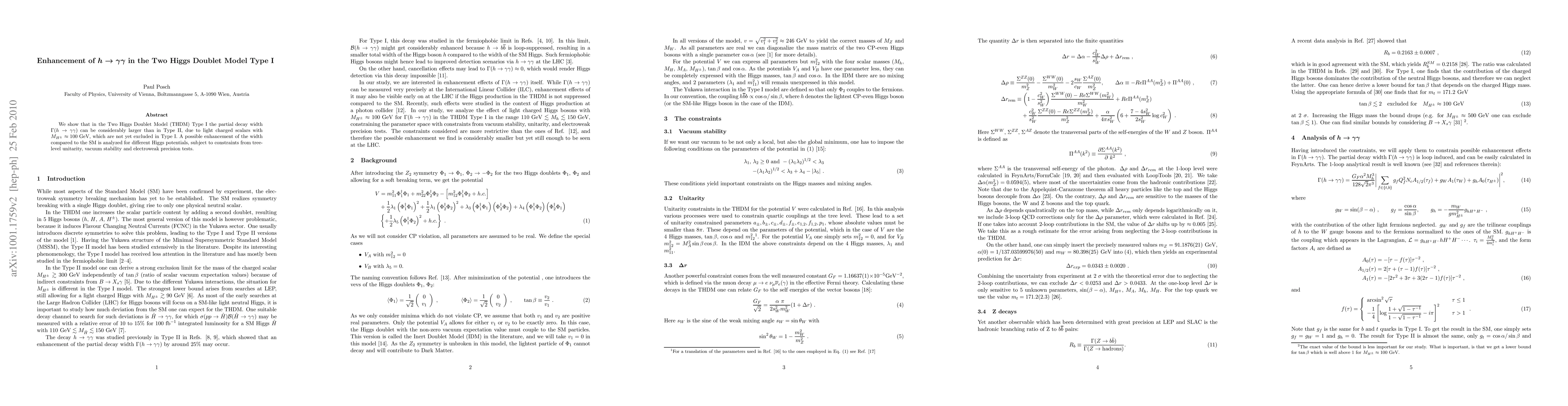 The paper demonstrates that in the Two Higgs Doublet Model Type I, the decay rate of h to gamma gamma can be significantly higher than in Type II, owing to light charged scalars around 100 GeV, still within experimental limits. The study examines possible width enhancements under various Higgs potentials, ensuring compliance with unitarity, vacuum stability, and electroweak precision tests.