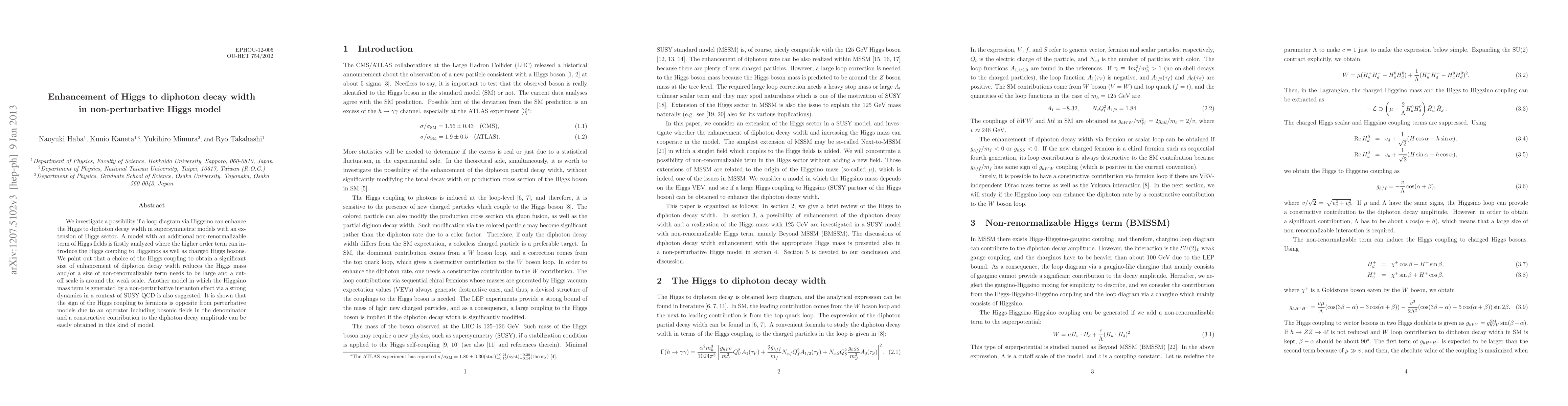 We investigate a possibility if a loop diagram via Higgsino can enhance the Higgs to diphoton decay width in supersymmetric models with an extension of Higgs sector. A model with an additional non-renormalizable term of Higgs fields is firstly analyzed where the higher order term can introduce the Higgs coupling to Higgsinos as well as charged Higgs bosons. We point out that a choice of the Higgs coupling to obtain a significant size of enhancement of diphoton decay width reduces the Higgs mass and/or a size of non-renormalizable term needs to be large and a cutoff scale is around the weak scale. Another model in which the Higgsino mass term is generated by a non-perturbative instanton effect via a strong dynamics in a context of SUSY QCD is also suggested. It is shown that the sign of the Higgs coupling to fermions is opposite from perturbative models due to an operator including bosonic fields in the denominator and a constructive contribution to the diphoton decay amplitude can be easily obtained in this kind of model.