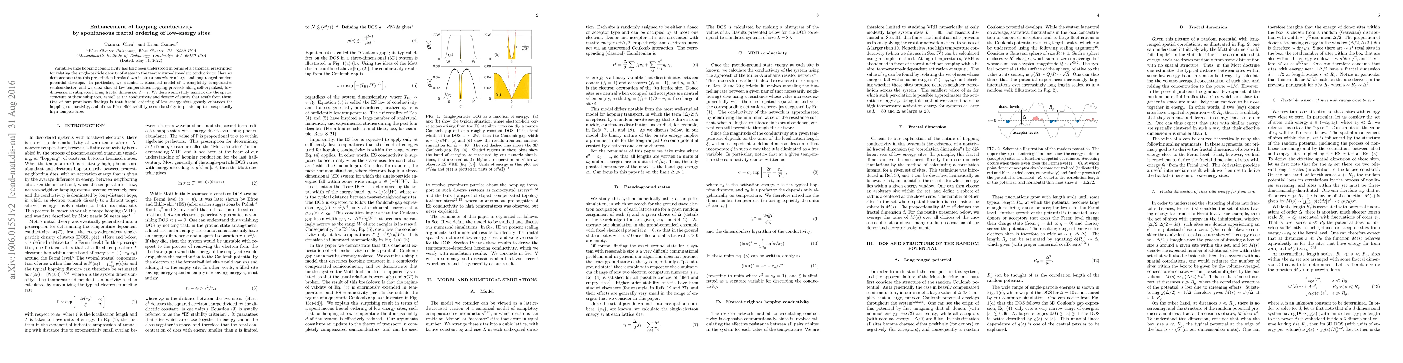Variable-range hopping conductivity has long been understood in terms of a canonical prescription for relating the single-particle density of states to the temperature-dependent conductivity. Here we demonstrate that this prescription breaks down in situations where a large and long-ranged random potential develops. In particular, we examine a canonical model of a completely compensated semiconductor, and we show that at low temperatures hopping proceeds along self-organized, low-dimensional subspaces having fractal dimension $d = 2$. We derive and study numerically the spatial structure of these subspaces, as well as the conductivity and density of states that result from them. One of our prominent findings is that fractal ordering of low energy sites greatly enhances the hopping conductivity, and allows Efros-Shklovskii type conductivity to persist up to unexpectedly high temperatures.