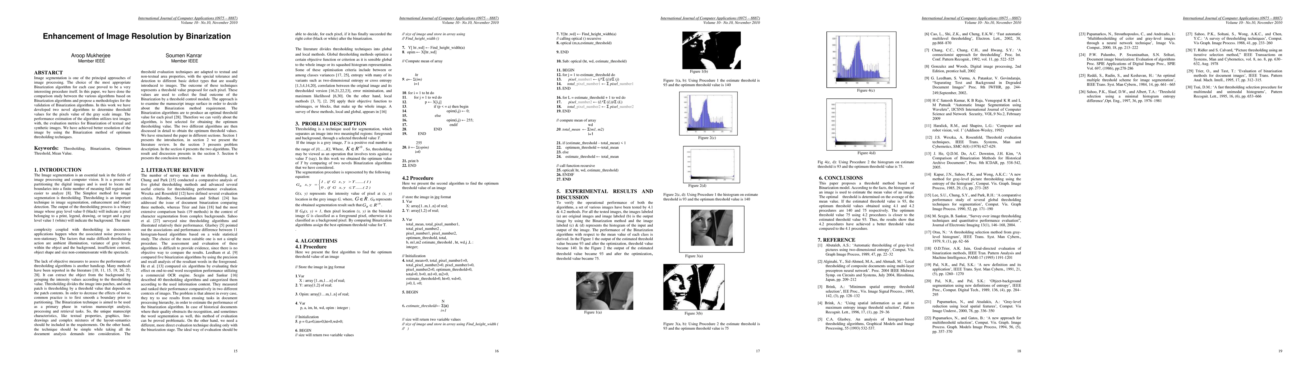 This paper proposes novel Binarization algorithms to enhance image resolution by optimizing threshold values for grey scale images, achieving better results than existing methods.