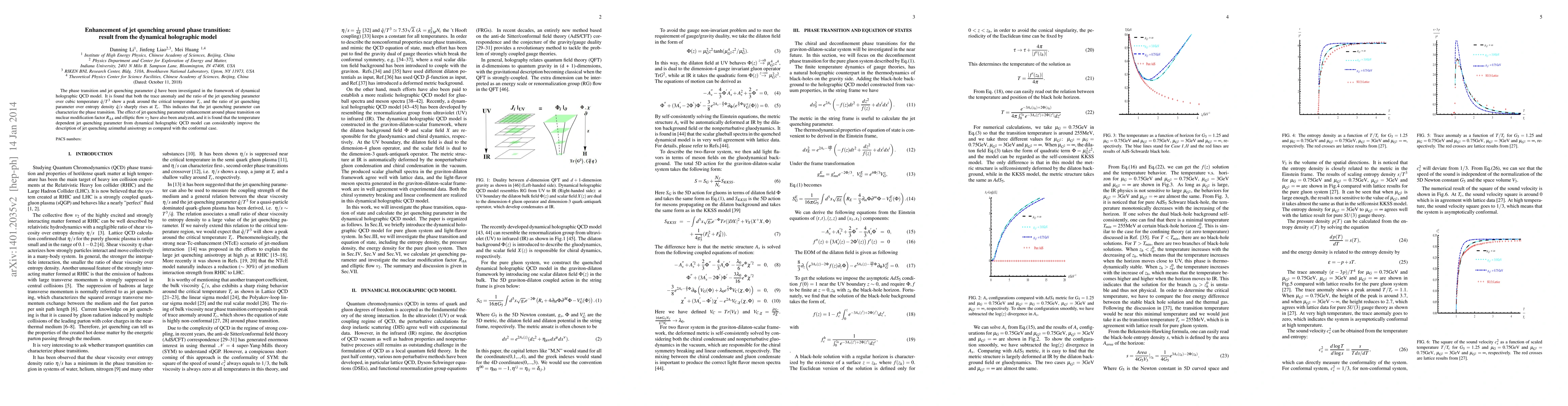 This paper investigates jet quenching around phase transitions using a dynamical holographic QCD model, finding a peak in the jet quenching parameter ${\hat q}$ near the critical temperature $T_c$. The study shows that the ratio ${\hat q}/T^3$ peaks and ${\hat q}/s$ sharply rises at $T_c$, indicating the jet quenching parameter characterizes the phase transition, and improves the description of jet quenching azimuthal anisotropy compared to conformal cases.