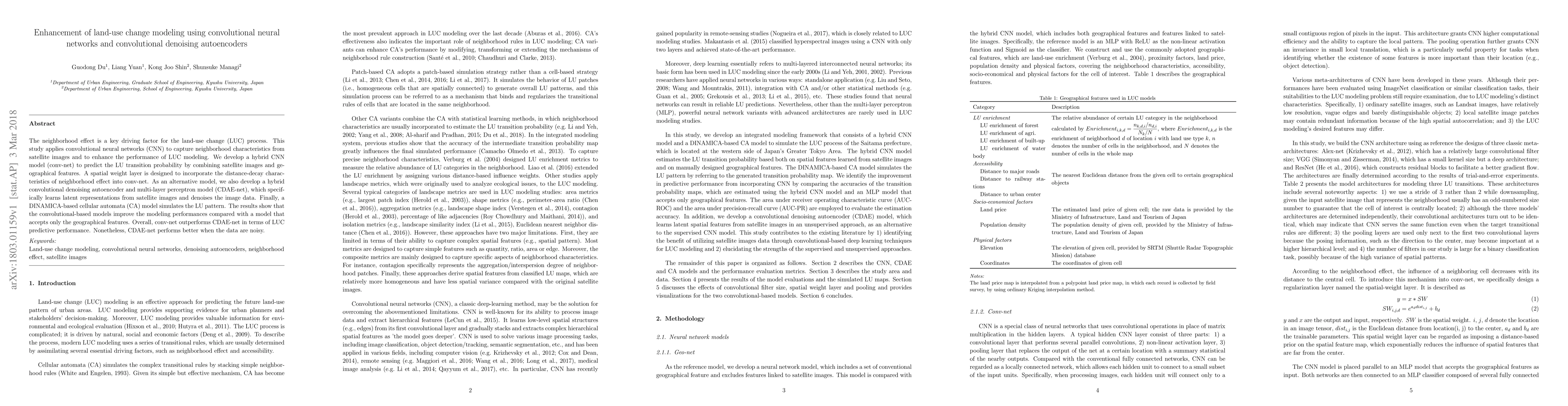 This study enhances land-use change modeling using convolutional neural networks (CNN) and convolutional denoising autoencoders (CDAE). It finds that CNN-based models, particularly the hybrid conv-net, outperform traditional models in predicting land-use transitions, especially when incorporating spatial weight layers.
