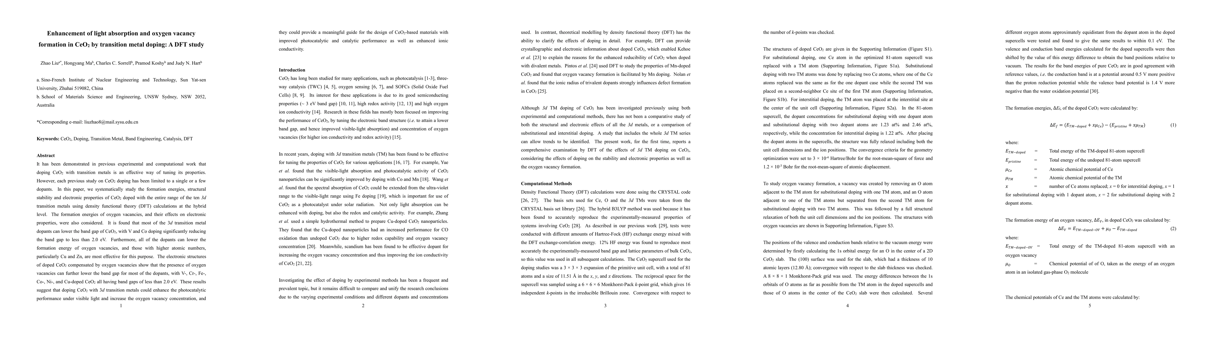 This study systematically investigates the effects of doping CeO2 with ten 3d transition metals using DFT calculations, finding that most dopants lower the band gap and enhance oxygen vacancy formation, with V and Co significantly reducing the band gap to less than 2.0 eV, suggesting improved photocatalytic performance under visible light.
