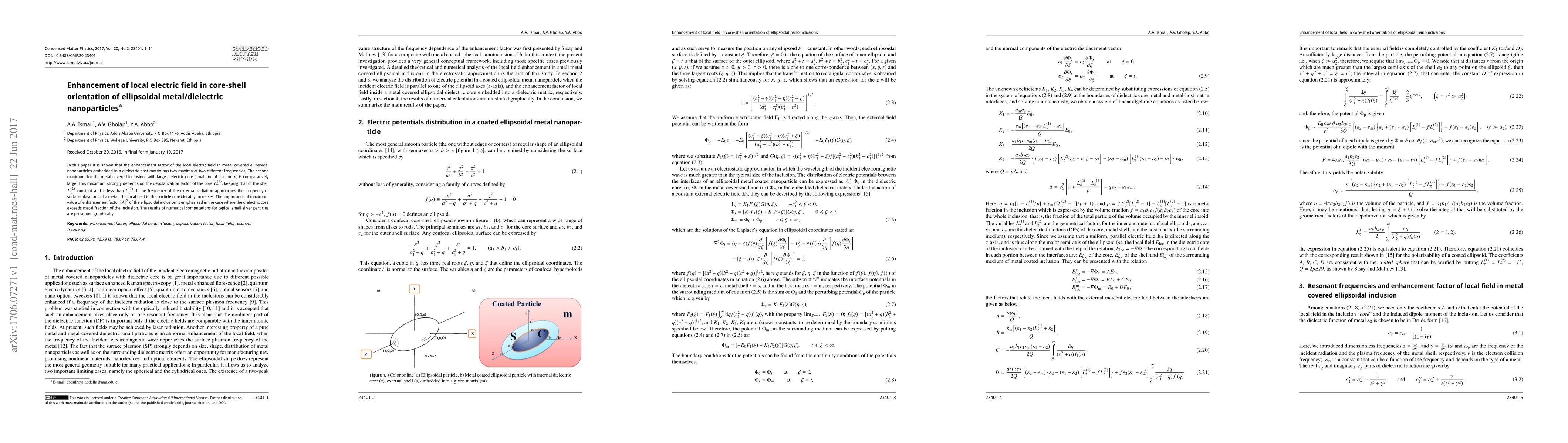 This paper demonstrates that ellipsoidal metal/dielectric nanoparticles exhibit two maxima in local electric field enhancement, with a notably larger second maximum when the dielectric core is large relative to the metal shell. The enhancement is significantly influenced by the core's depolarization factor. Numerical results show substantial field amplification near metal's plasmon resonance frequency.